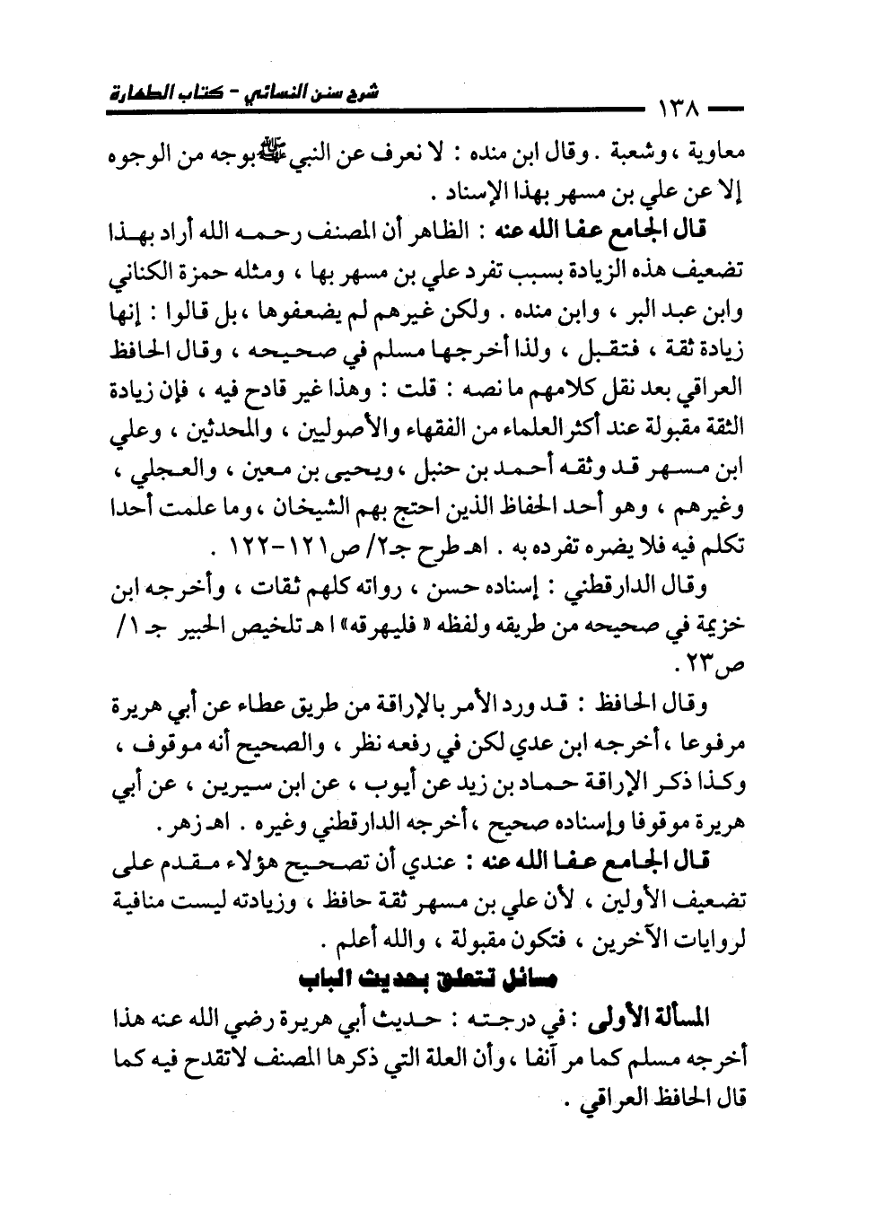 قال الجامع عفا الله عنه: الظاهر أن المصنف رحمه الله أراد بهذا تضعيف هذه الزيادة بسبب تفرد علي بن مسهر بها، ومثله حمزة الكناني وابن عبد البر، وابن منده. ولكن غيرهم لم يضعفوها، بل قالوا: إنها زيادة ثقة، فتقبل، ولذا أخرجها مسلم في صحيحه، وقال الحافظ العراقي بعد نقل كلامهم ما نصه: قلت: وهذا غير قادح فيه، فإن زيادة الثقة مقبولة عند أكثر العلماء من الفقهاء والأصوليين، والمحدثين، وعلي ابن مسهر قد وثقه أحمد بن حنبل، ويحيى بن معين، والعجلي، وغيرهم، وهو أحد الحفاظ الذين احتج بهم الشيخان، وما علمت أحدا تكلم فيه فلا يضره تفرده به. اهـ طرح جـ 2/ ص 121 - 122.