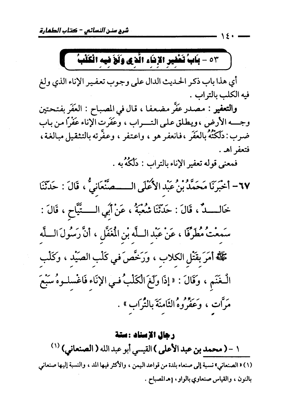 67 - أَخْبَرَنَا مُحَمَّدُ بْنُ عَبْدِ الأَعْلَى الصَّنْعَانِيُّ، قَالَ: حَدَّثَنَا خَالِدٌ، قَالَ: حَدَّثَنَا شُعْبَةُ، عَنْ أَبِي التَّيَّاحِ، قَالَ: سَمِعْتُ مُطَرِّفًا، عَنْ عَبْدِ اللهِ بْنِ الْمُغَفَّلِ، أَنَّ رَسُولَ اللهِ - صلى الله عليه وسلم - أَمَرَ بِقَتْلِ الْكِلاَبِ، وَرَخَّصَ فِي كَلْبِ الصَّيْدِ، وَكَلْبِ الْغَنَمِ، وَقَالَ: "إِذَا وَلَغَ الْكَلْبُ فِي الإِنَاءِ فَاغْسِلُوهُ سَبْعَ مَرَّاتٍ وَعَفِّرُوهُ الثَّامِنَةَ بِالتُّرَابِ".