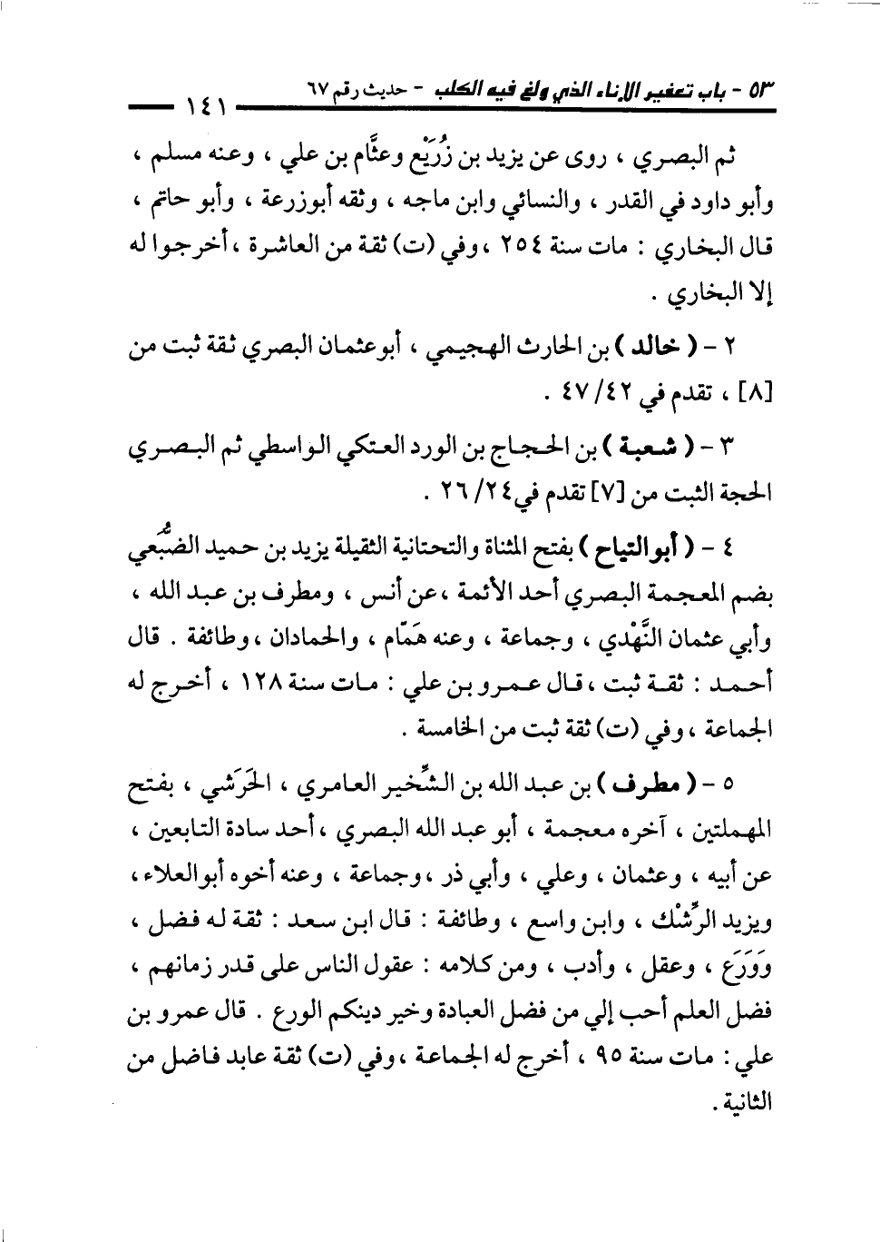 5 - (مطرف) بن عبد الله بن الشِّخير العامري، الحَرَشي، بفتح المهملتين، آخره معجمة، أبو عبد الله البصري، أحد سادة التابعين، عن أبيه، وعثمان، وعلي، وأبي ذر، وجماعة، وعنه أخوه أبو العلاء، ويزيد الرِّشْك، وابن واسع، وطائفة: قال ابن سعد: ثقة له فضل، وَوَرعَ، وعقل، وأدب، ومن كلامه: عقول الناس على قدر زمانهم، فضل العلم أحب إلى من فضل العبادة وخير دينكم الورع. قال عمرو بن علي: مات سنة 95، أخرج له الجماعة، وفي (ت) ثقة عابد فاضل من الثانية.