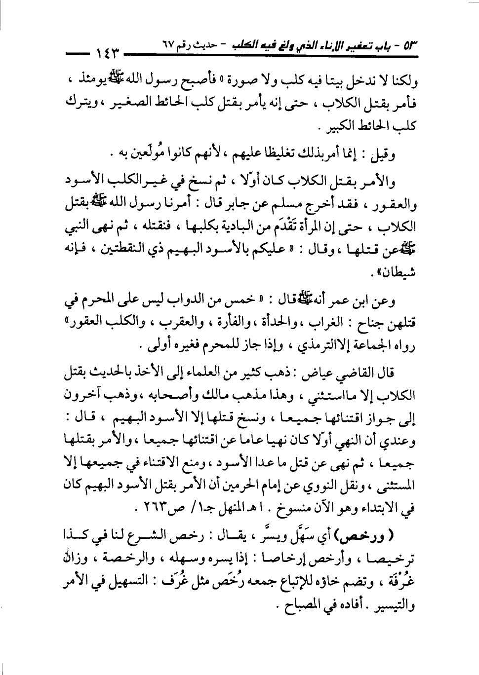 قال القاضي عياض: ذهب كثير من العلماء إلى الأخذ بالحديث بقتل الكلاب إلا ما استثني، وهذا مذهب مالك وأصحابه، وذهب آخرون إلى جواز اقتنائها جميعا، ونسخ قتلها إلا الأسود البهيم، قال: وعندي أن النهي أوّلا كان نهيا عاما عن اقتنائها جميعا، والأمر بقتلها جميعًا، ثم نهى عن قتل ما عدا الأسود، ومنع الاقتناء في جميعها إلا المستثنى، ونقل النووي عن إمام الحرمين أن الأمر بقتل الأسود البهيم كان في الابتداء وهو الآن منسوخ. اهـ المنهل جـ 1 / ص 263.