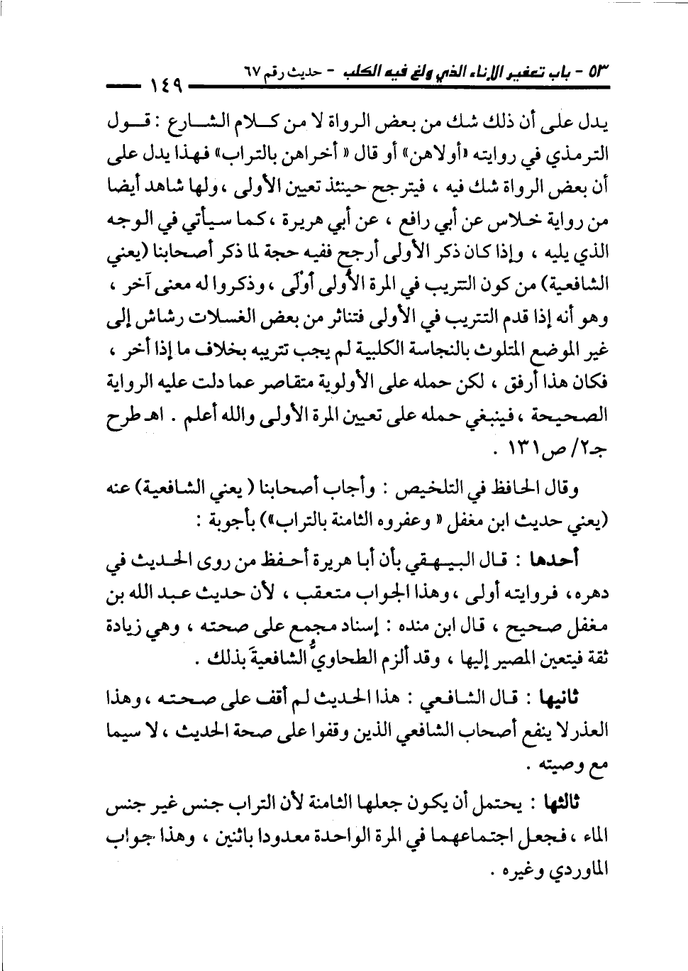 وقال الحافظ في التلخيص: وأجاب أصحابنا (يعني الشافعية) عنه (يعني حديث ابن مغفل "وعفروه الثامنة بالتراب") بأجوبة: