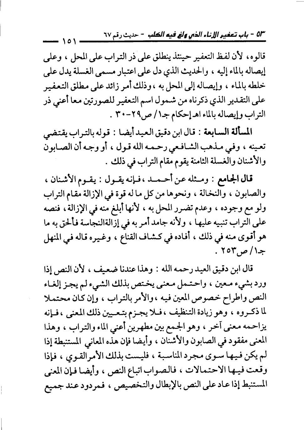 قال ابن دقيق العيد رحمه الله: وهذا عندنا ضعيف؛ لأن النص إذا ورد بشيء معين، واحتمل معنى يختص بذلك الشيء لم يجز إلغاء النص واطراح خصوص المعين فيه، والأمر بالتراب، وإن كان محتملا لما ذكروه، وهو زيادة التنظيف، فلا يجزم بتعيين ذلك المعنى، فإنه يزاحمه معنى آخر، وهو الجمع بين مطهرين أعني الماء والتراب، وهذا المعنى مفقود في الصابون والأشنان، وأيضا فإن هذه المعاني المستنبطة إذا لم يكن فيها سوى مجرد المناسبة، فليست بذلك الأمر القوي، فإذا وقعت فيها الاحتمالات، فالصواب اتباع النص، وأيضًا فإن المعنى المستنبط إذا عاد على النص بالإبطال والتخصيص، فمردود عند جميع
