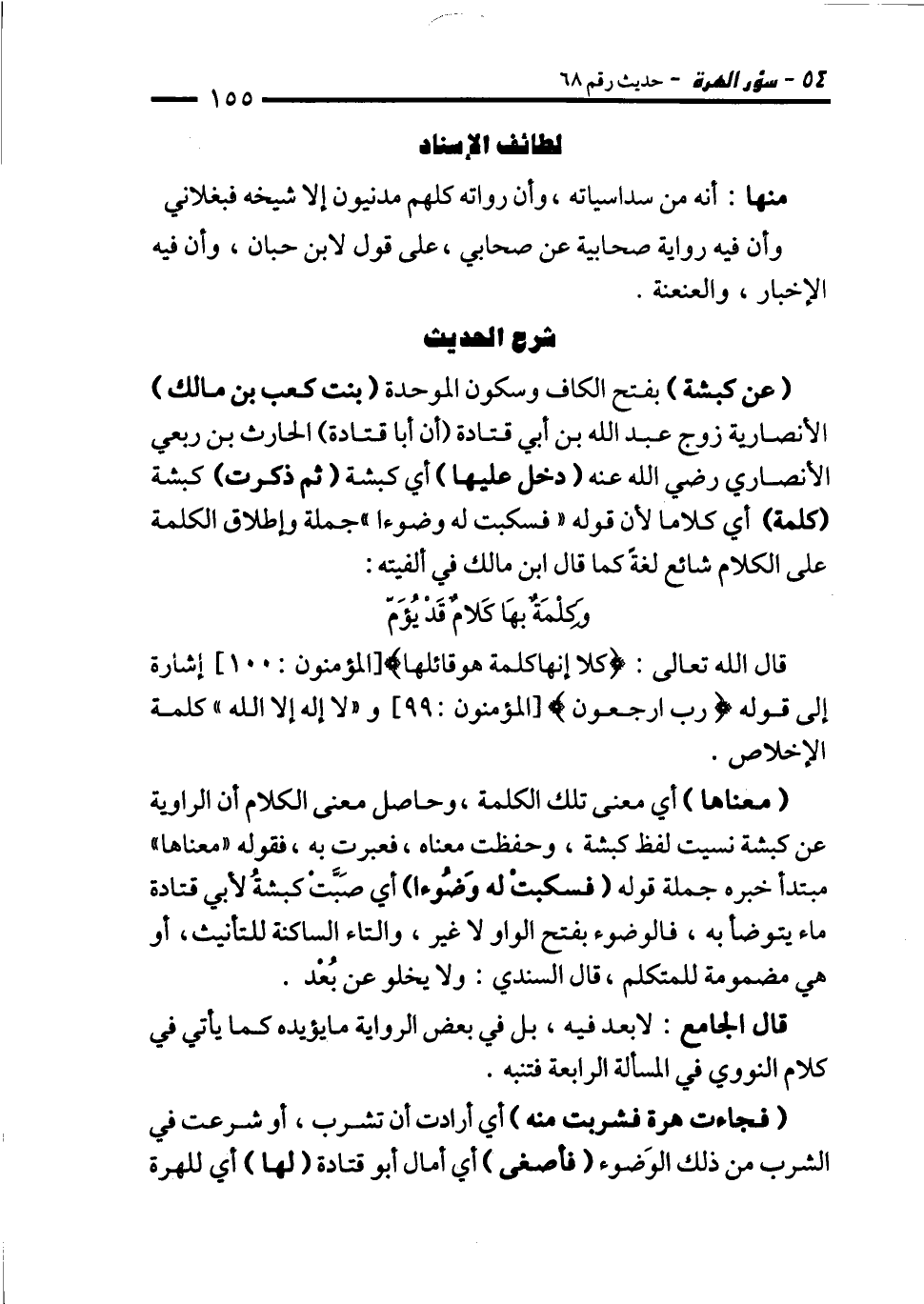 (عن كبشة) بفتح الكاف وسكون الموحدة (بنت كعب بن مالك) الأنصارية زوج عبد الله بن أبي قتادة (أن أبا قتادة) الحارث بن ربعي الأنصاري رضي الله عنه (دخل عليها) أي كبشة (ثم ذكرت) كبشة (كلمة) أي كلاما لأن قوله "فسكبت له وضوءا" جملة وإطلاق الكلمة على الكلام شائع لغةً كما قال ابن مالك في ألفيته: