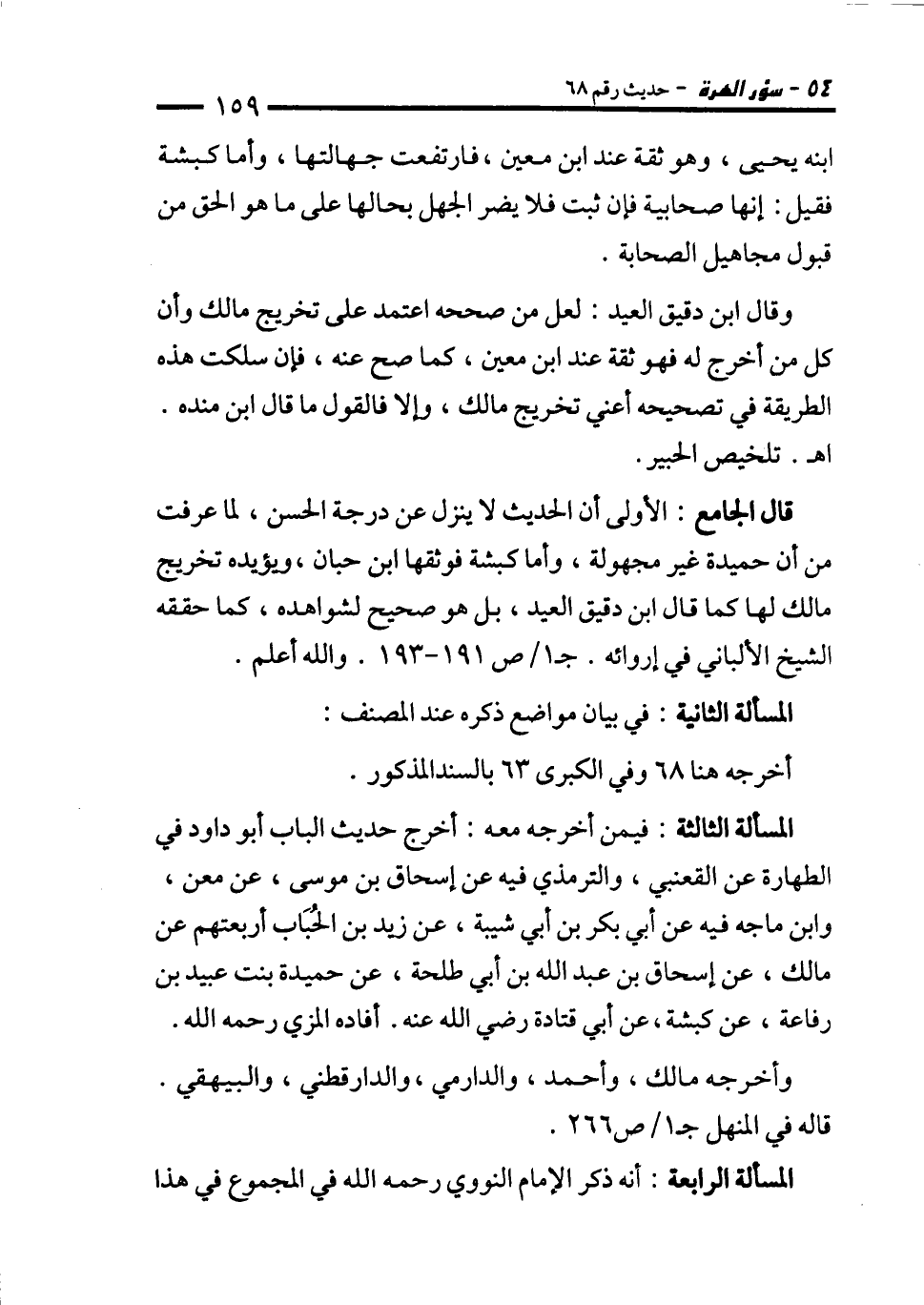 قال الجامع: الأولى أن الحديث لا ينزل عن درجة الحسن، لما عرفت من أن حميدة غير مجهولة، وأما كبشة فوثقها ابن حبان، ويؤيده تخريج مالك لها كما قال ابن دقيق العيد، بل هو صحيح لشواهده، كما حققه الشيخ الألباني في إروائه. جـ 1/ ص 191 - 193. والله أعلم.