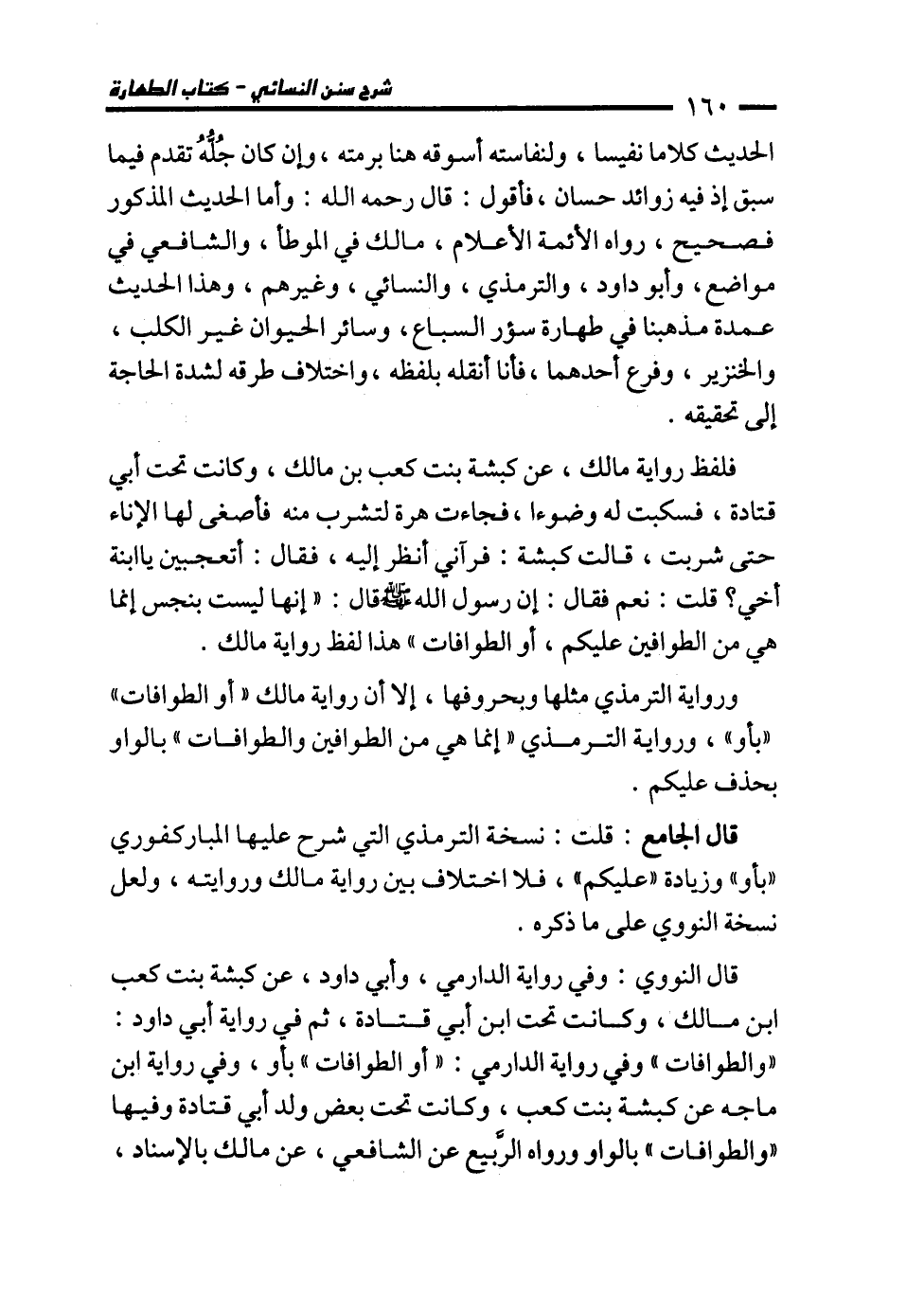 ورواية الترمذي مثلها وبحروفها، إلا أن رواية مالك "أو الطوافات" "بأو"، ورواية الترمذي "إنما هي من الطوافين والطوافات" بالواو بحذف عليكم.
