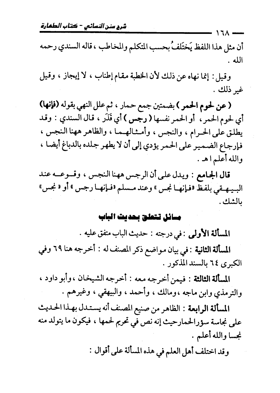 المسألة الرابعة: الظاهر من صنيع المصنف أنه يستدل بهذا الحديث على نجاسة سؤر الحمارحيث إنه نص في تحريم لحمها، فيكون ما يتولد منه نجسا والله أعلم.