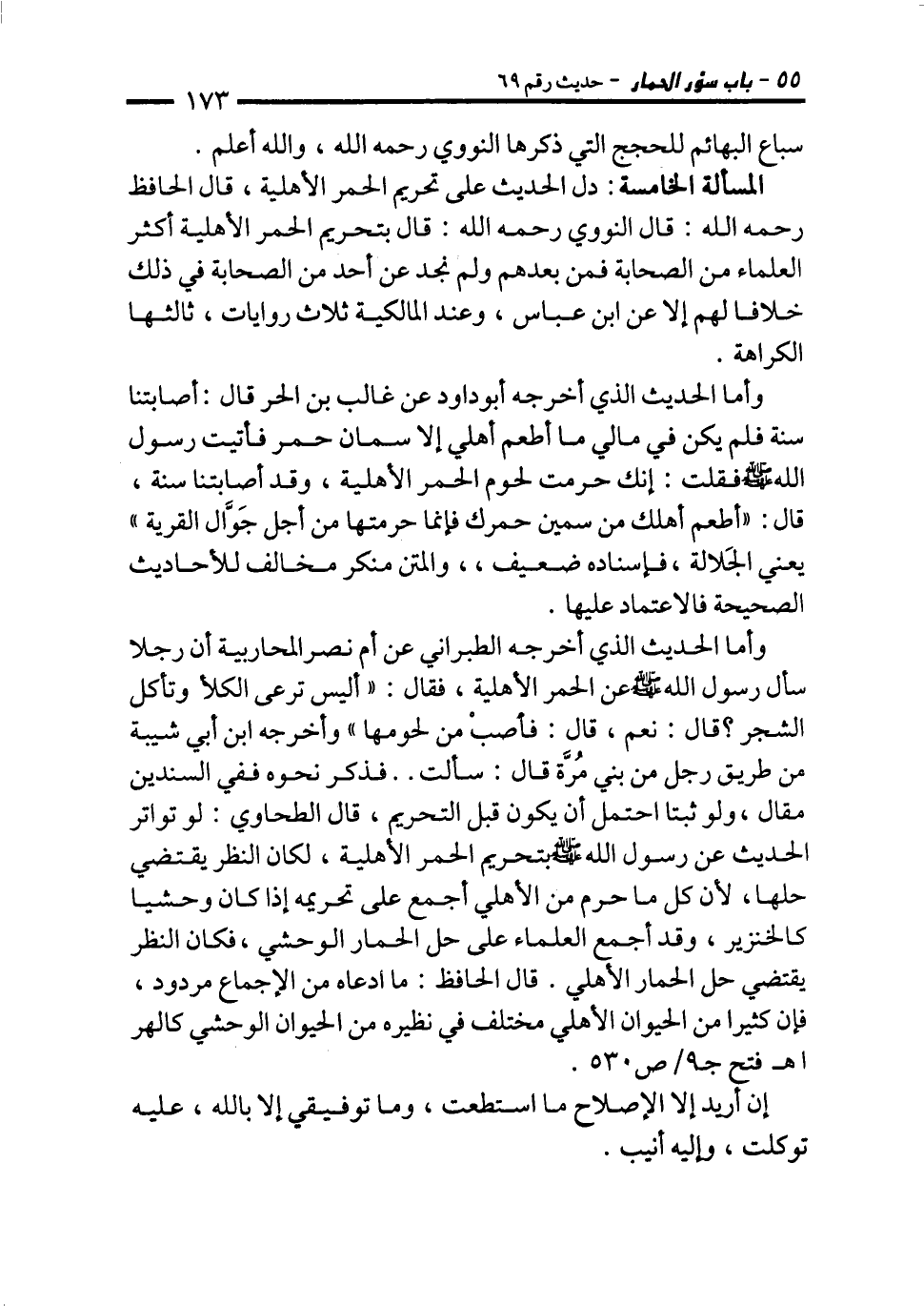 يقتضي حل الحمار الأهلي. قال الحافظ: ما ادعاه من الإجماع مردود، فإن كثيرا من الحيوان الأهلي مختلف في نظيره من الحيوان الوحشي كالهر اهـ فتح جـ 1/ ص 530.