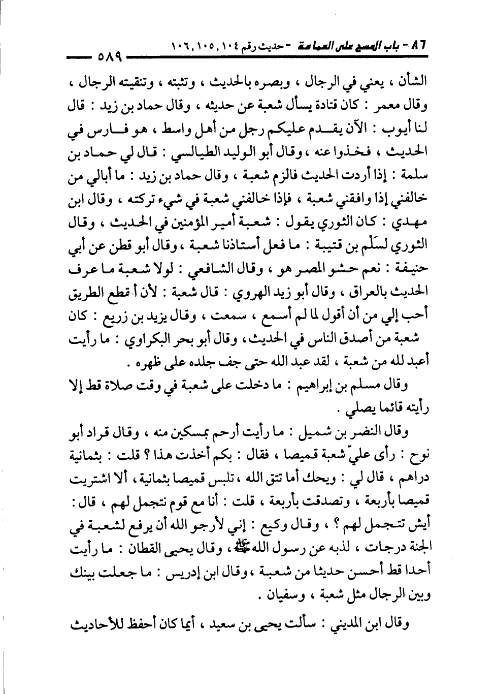 الشأن، يعني في الرجال، وبصره بالحديث، وتثبته، وتنقيته الرجال، وقال معمر: كان قتادة يسأل شعبة عن حديثه، وقال حماد بن زيد: قال لنا أيوب: الآن يقدم عليكم رجل من أهل واسط، هو فارس في الحديث، فخذوا عنه، وقال أبو الوليد الطيالسي: قال لي حماد بن سلمة: إذا أردت الحديث فالزم شعبة، وقال حماد بن زيد: ما أبالي من خالفني إذا وافقني شعبة، فهذا خالفني شعبة في شيء تركته، وقال ابن مهدي: كان الثوري يقول: شعبة أمير المؤمنين في الحديث، وقال الثوري لسَلْم بن قتيبة: ما فعل أستاذنا شعبة، وقال أبو قطن عن أبي حنيفة: نعم حشو المصر هو، وقال الشافعي: لولا شعبة ما عرف الحديث بالعراق، وقال أبو زيد الهروي: قال شعبة: لأن أقطع الطريق أحب إلى من أن أقول لما لم أسمع، سمعت، وقال يزيد بن زريع: كان شعبة من أصدق الناس في الحديث، وقال أبو بحر البكراوي: ما رأيت أعبد لله من شعبة، لقد عبد الله حتى جف جلده على ظهره.