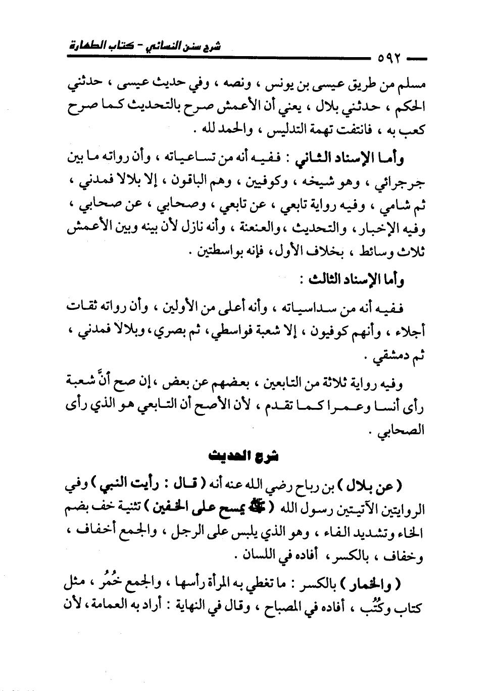 (عن بلال) بن رباح رضي الله عنه أنه (قال: رأيت النبي) وفي الروايتين الآتيتين رسول الله (- صلى الله عليه وسلم - يمسح على الحفين) تثنية خف بضم الخاء وتشديد الفاء، وهو الذي يلبس على الرجل، والجمع أخفاف، وخفاف، بالكسر، أفاده في اللسان.