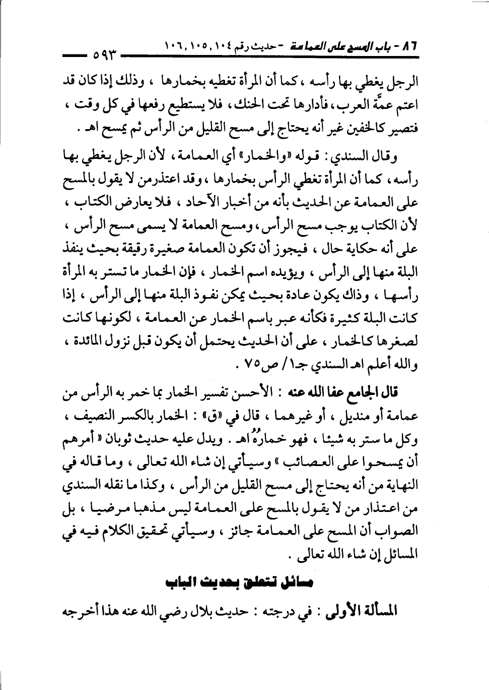 قال الجامع عفا الله عنه: الأحسن تفسير الخمار بما خمر به الرأس من عمامة أو منديل، أو غيرهما، قال في "ق": الخمار بالكسر النصيف، وكل ما ستر به شيئا، فهو خمارُهُ اهـ. ويدل عليه حديث ثوبان "أمرهم أن يمسحوا على العصائب" وسيأتي إن شاء الله تعالى، وما قاله في النهاية من أنه يحتاج إلى مسح القليل من الرأس، وكذا ما نقله السندي من اعتذار من لا يقول بالمسح على العمامة ليس مذهبا مرضيا، بل الصواب أن المسح على العمامة جائز، وسيأتي تحقيق الكلام فيه في المسائل إن شاء الله تعالى.