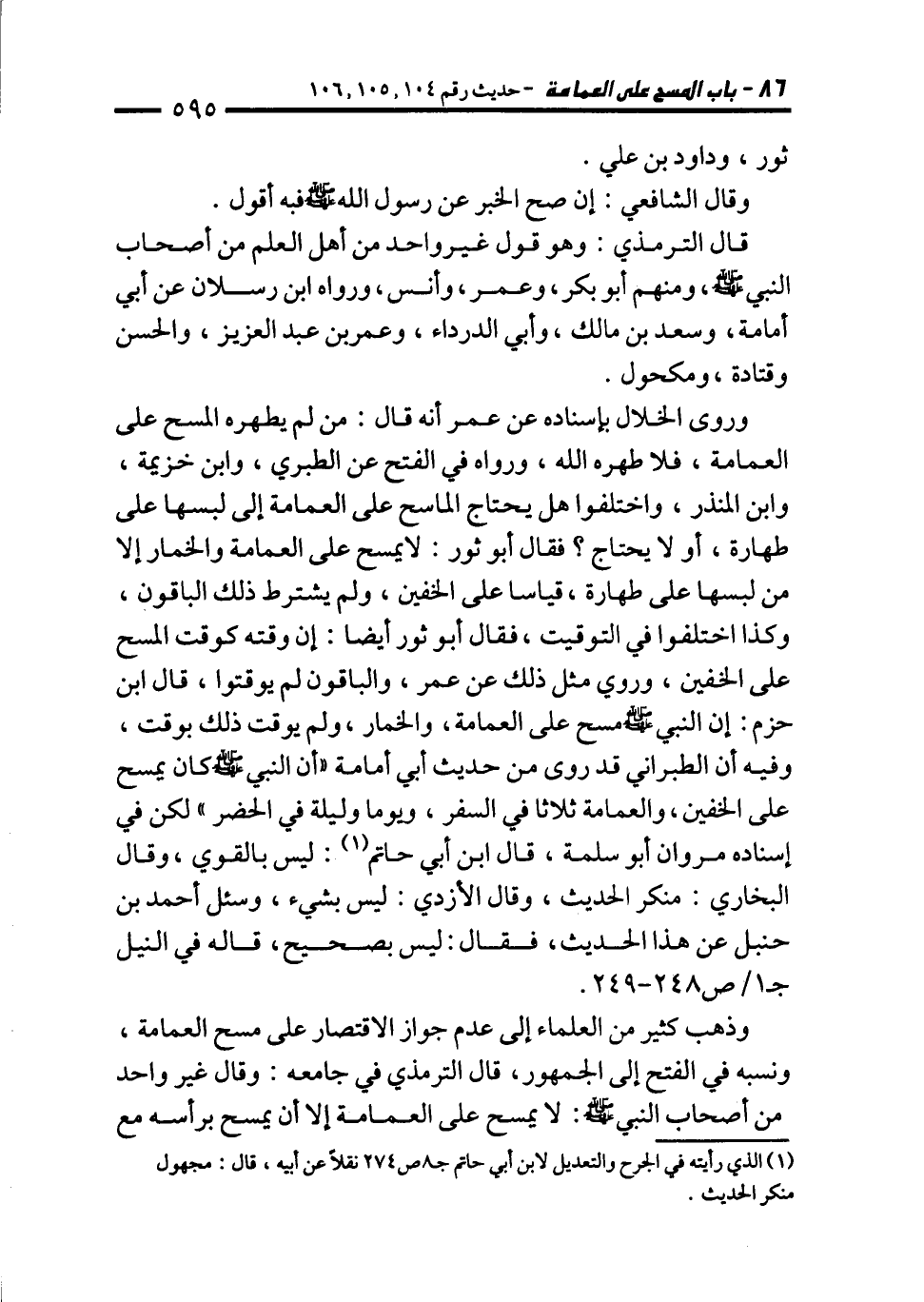 وذهب كثير من العلماء إلى عدم جواز الاقتصار على مسح العمامة، ونسبه في الفتح إلى الجمهور، قال الترمذي في جامعه: وقال غير واحد من أصحاب النبي - صلى الله عليه وسلم -: لا يمسح على العمامة إلا أن يمسح برأسه مع