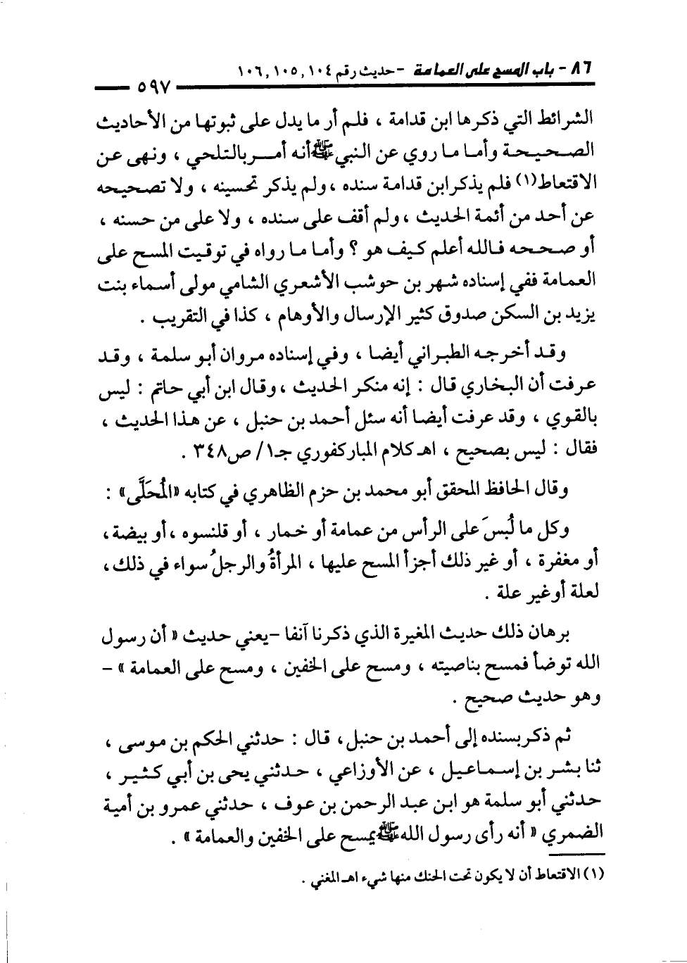 الشرائط التي ذكرها ابن قدامة، فلم أر ما يدل على ثبوتها من الأحاديث الصحيحة وأما ما روي عن النبي - صلى الله عليه وسلم - أنه أمر بالتلحي، ونهى عن الاقتعاط (¬1) فلم يذكر ابن قدامة سنده، ولم يذكر تحسينه، ولا تصحيحه عن أحد من أئمة الحديث، ولم أقف على سنده، ولا على من حسنه، أو صححه فالله أعلم كيف هو؟ وأما ما رواه في توقيت المسح على العمامة ففي إسناده شهر بن حوشب الأشعري الشامي مولى أسماء بنت يزيد بن السكن صدوق كثير الإرسال والأوهام، كذا في التقريب.