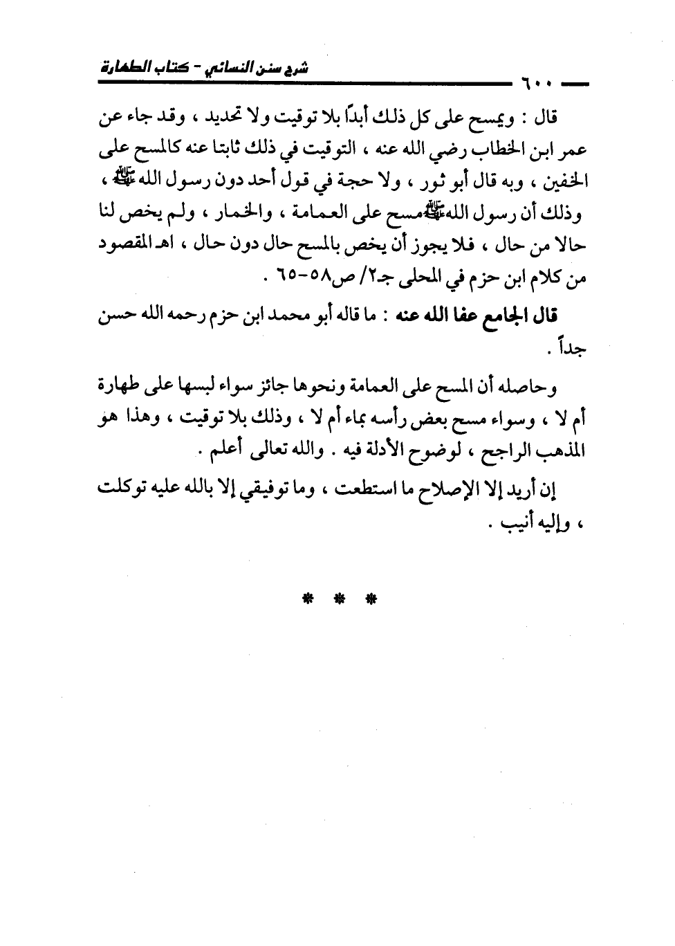 قال: ويمسح على كل ذلك أبدًا بلا توقيت ولا تحديد، وقد جاء عن عمر ابن الخطاب رضي الله عنه، التوقيت في ذلك ثابتا عنه كالمسح على الخفين، وبه قال أبو ثور، ولا حجة في قول أحد دون رسول الله - صلى الله عليه وسلم -، وذلك أن رسول الله - صلى الله عليه وسلم - مسح على العمامة، والخمار، ولم يخص لنا حالا من حال، فلا يجوز أن يخص بالمسح حال دون حال، اهـ المقصود من كلام ابن حزم في المحلى جـ 2/ ص 58 - 65.