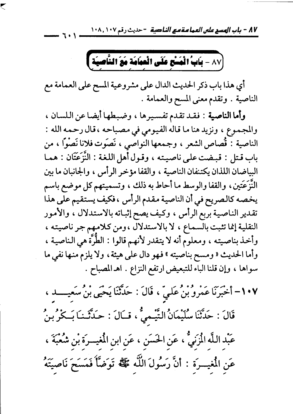 107 - أَخْبَرَنَا عَمْرُو بْنُ عَلِيٍّ، قَالَ: حَدَّثَنِي يَحْيَى بْنُ سَعِيدٍ، قَالَ: حَدَّثَنَا سُلَيْمَانُ التَّيْمِيُّ، قَالَ: حَدَّثَنَا بَكْرُ بْنُ عَبْدِ اللهِ الْمُزَنِيُّ، عَنِ الْحَسَنِ، عَنِ ابْنِ الْمُغِيرَةِ بْنِ شُعْبَةَ، عَنِ الْمُغِيرَةِ: أَنَّ رَسُولَ اللهِ - صلى الله عليه وسلم - تَوَضَّأَ فَمَسَحَ نَاصِيَتَهُ