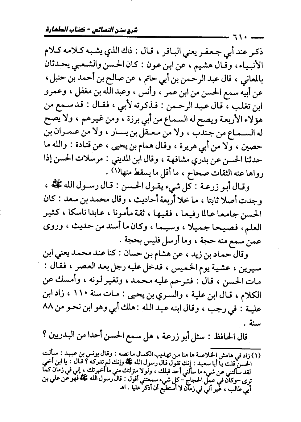 (¬1) زاد في هامش الخلاصة ها هنا من تهذيب الكمال ما نصه: وقال يونس بن عبيد: سألت الحسن قلت يا أبا سعيد: إنك تقول قال رسول الله - صلى الله عليه وسلم - وإنك لم تدركه؟ قال: يا ابن أخي لقد سألتني عن شيء ما سألني أحد قبلك، ولولا منزلتك مني ما أخبرتك، إني في زمان كما ترى -وكان في عمل الحجاج- كل شيء سمعتني أقول: قال رسول الله - صلى الله عليه وسلم - فهو عن علي بن أبي طالب، غير أني في زمن لا أستطيع أن أذكر عليا. اهـ