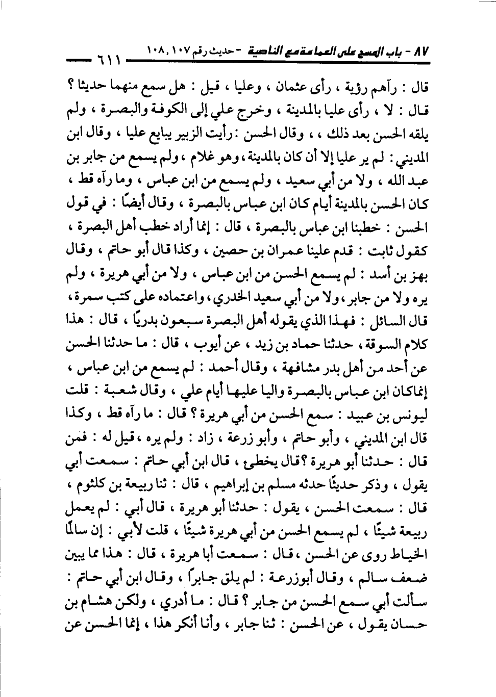 قال: رآهم رؤية، رأى عثمان، وعليا، قيل: هل سمع منهما حديثا؟ قال: لا، رأى عليا بالمدينة، وخرج علي إلى الكوفة والبصرة، ولم يلقه الحسن بعد ذلك، وقال الحسن: رأيت الزبير يبايع عليا، وقال ابن المديني: لم ير عليا إلا أن كان بالمدينة، وهو غلام، ولم يسمع من جابر بن عبد الله، ولا من أبي سعيد، ولم يسمع من ابن عباس، وما رآه قط، كان الحسن بالمدينة أيام كان ابن عباس بالبصرة، وقال أيضا: في قول الحسن: خطبنا ابن عباس بالبصرة، قال: إنما أراد خطب أهل البصرة، كقول ثابت: قدم علينا عمران بن حصين، وكذا قال أبو حاتم، وقال بهز بن أسد: لم يسمع الحسن من ابن عباس، ولا من أبي هريرة، ولم يره ولا من جابر، ولا من أبي سعيد الخدري، واعتماده على كتب سمرة، قال السائل: فهذا الذي يقوله أهل البصرة سبعون بدريًا، قال: هذا كلام السوقة، حدثنا حماد بن زيد، عن أيوب، قال: ما حدثنا الحسن عن أحد من أهل بدر مشافهة، وقال أحمد: لم يسمع من ابن عباس، إنما كان ابن عباس بالبصرة واليا عليها أيام علي، وقال شعبة: قلت ليونس بن عبيد: سمع الحسن من أبي هريرة؟ قال: ما رآه قط، وكذا قال ابن المديني، وأبو حاتم، وأبو زرعة، زاد: ولم يره، قيل له: فمن قال: حدثنا أبو هريرة؟ قال يخطئ، قال ابن أبي حاتم: سمعت أبي يقول، وذكر حديثًا حدثه مسلم بن إبراهيم، قال: ثنا ربيعة بن كلثوم، قال: سمعت الحسن، يقول: حدثنا أبو هريرة، قال أبي: لم يعمل ربيعة شيئًا، لم يسمع الحسن من أبي هريرة شيئًا، قلت لأبي: إن سالمًا الخياط روى عن الحسن، قال: سمعت أبا هريرة، قال: هذا مما يبين ضعف سالم، وقال أبوزرعة: لم يلق جابرًا، وقال ابن أبي حاتم: سألت أبي سمع الحسن من جابر؟ قال: ما أدري، ولكن هشام بن حسان يقول، عن الحسن: ثنا جابر، وأنا أنكر هذا، إنما الحسن عن
