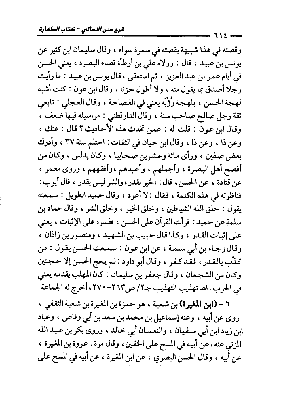 6 - (ابن المغيرة) بن شعبة، هو حمزة بن المغيرة بن شعبة الثقفي، روى عن أبيه، وعنه إسماعيل بن محمَّد بن سعد بن أبي وقاص، وعباد ابن زياد ابن أبي سفيان، والنعمان أبي خالد، وروى بكر بن عبد الله المزني عنه، عن أبيه في المسح على الخفين، وقال مرة: عروة بن المغيرة، عن أبيه، وقال الحسن البصري، عن ابن المغيرة، عن أبيه في المسح على