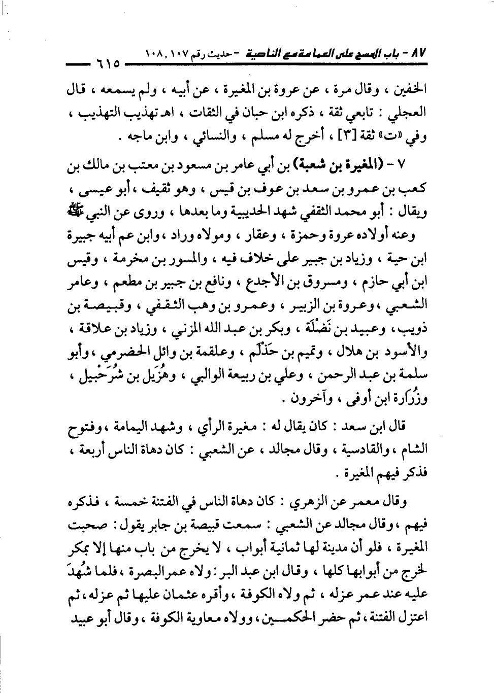 الخفين، وقال مرة، عن عروة بن المغيرة، عن أبيه، ولم يسمعه، قال العجلي: تابعي ثقة، ذكره ابن حبان في الثقات، اهـ تهذيب التهذيب، وفي "ت" ثقة [3]، أخرج له مسلم، والنسائي، وابن ماجه.