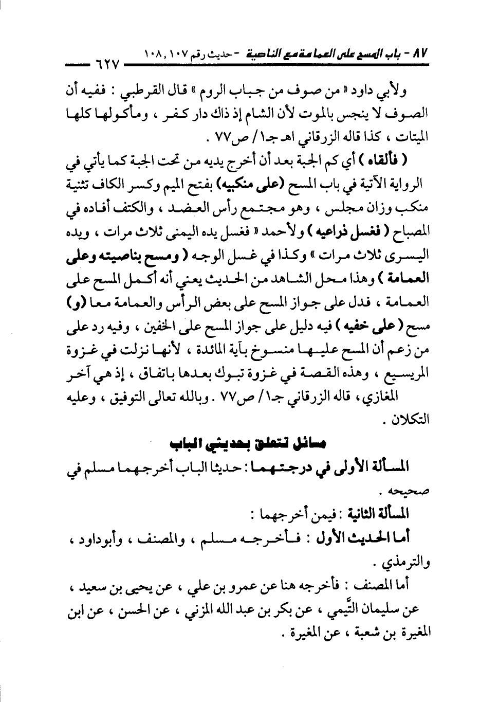 (فألقاه) أي كم الجبة بعد أن أخرج يديه من تحت الجبة كما يأتي في الرواية الآتية في باب المسح (على منكبيه) بفتح الميم وكسر الكاف تثنية منكب وزان مجلس، وهو مجتمع رأس العضد، والكتف أفاده في المصباح (فغسل فراعيه) ولأحمد "فغسل يده اليمنى ثلاث مرات، ويده اليسرى ثلاث مرات" وكذا في غسل الوجه (ومسح بناصيته وعلى العمامة) وهذا محل الشاهد من الحديث يعني أنه أكمل المسح على العمامة، فدل على جواز المسح على بعض الرأس والعمامة معا (و) مسح (على خفيه) فيه دليل على جواز المسح على الخفين، وفيه رد على من زعم أن المسح عليها منسوخ بآية المائدة؛ لأنها نزلت في غزوة المريسيع، وهذه القصة في غزوة تبوك بعدها باتفاق، إذ هي آخر المغازي، قاله الزرقاني جـ 1/ ص 77. وبالله تعالى التوفيق، وعليه التكلان.