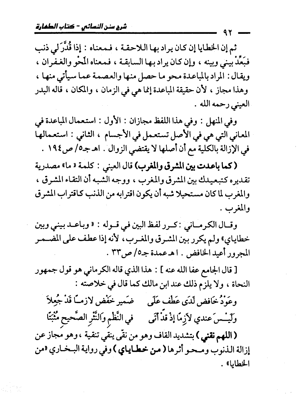 (كما باعدت بين المشرق والمغرب) قال العيني: كلمة "ما" مصدرية تقديره كتبعيدك بين المشرق والمغرب، ووجه الشبه أن التقاء المشرق، والمغرب لما كان مستحيلا شبه أن يكون اقترابه من الذنب كاقتراب المشرق والمغرب.