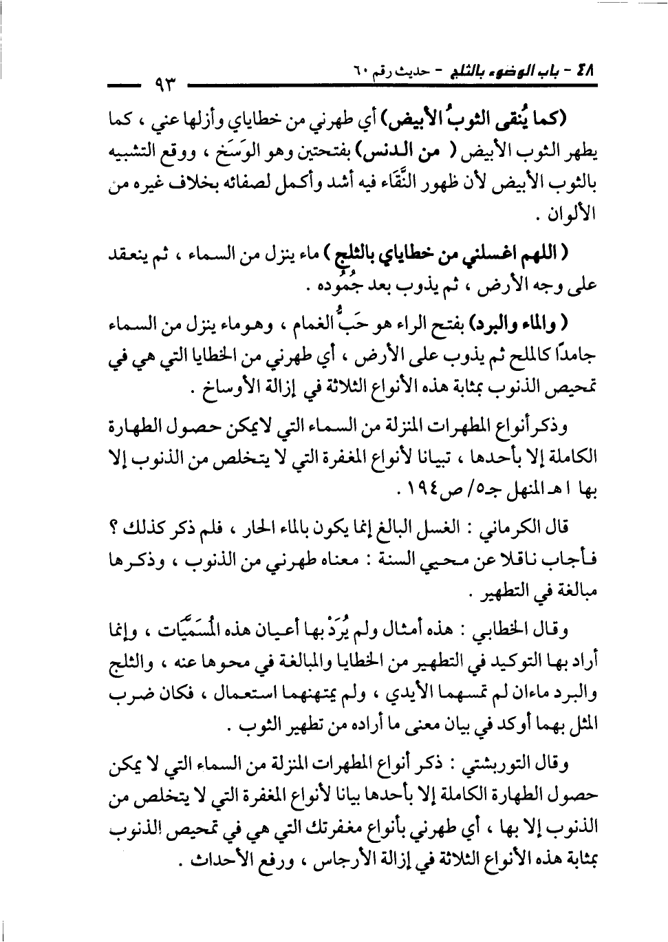 (اللهم اغسلني من خطاياي بالثلج) ماء ينزل من السماء، ثم ينعقد على وجه الأرض، ثم يذوب بعد جُمُوده.