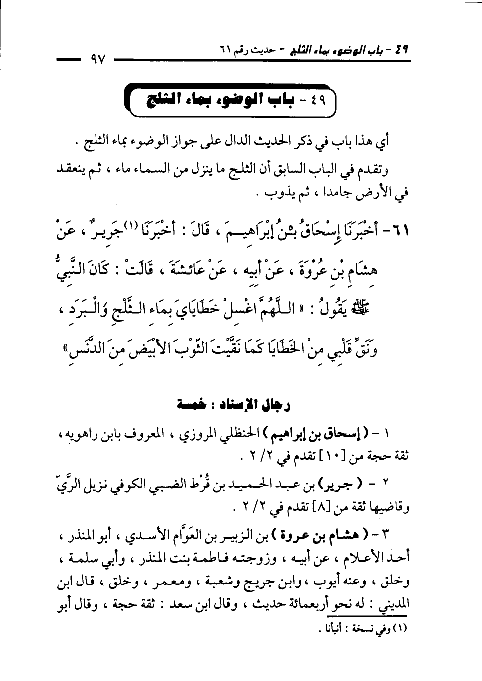 61 - أَخْبَرَنَا إِسْحَاقُ بْنُ إِبْرَاهِيمَ، قَالَ: أَخْبَرَنَا (¬1) جَرِيرٌ، عَنْ هِشَامِ بْنِ عُرْوَةَ، عَنْ أَبِيهِ، عَنْ عَائِشَةَ، قَالَتْ: كَانَ النَّبِيُّ - صلى الله عليه وسلم - يَقُولُ: "اللَّهُمَّ اغْسِلْ خَطَايَايَ بِمَاءِ الثَّلْجِ وَالْبَرَدِ، وَنَقِّ قَلْبِي مِنَ الْخَطَايَا كَمَا نَقَّيْتَ الثَّوْبَ الأَبْيَضَ مِنَ الدَّنَسِ".