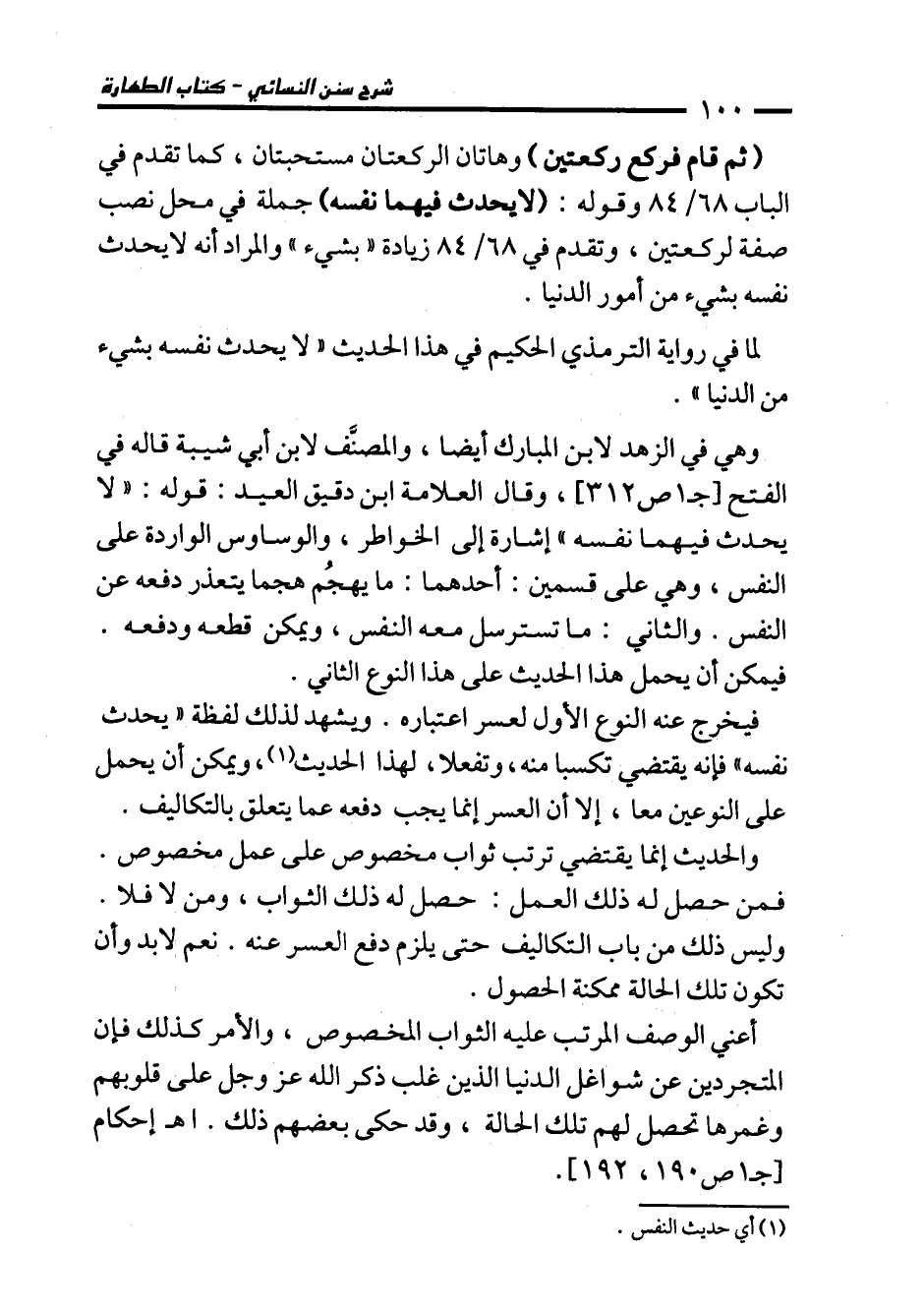 النفس، وهي على قسمين: أحدهما: ما يهجُم هجما يتعذر دفعه عن النفس. والثاني: ما تسترسل معه النفس، ويمكن قطعه ودفعه. فيمكن أن يحمل هذا الحديث على هذا النوع الثاني.