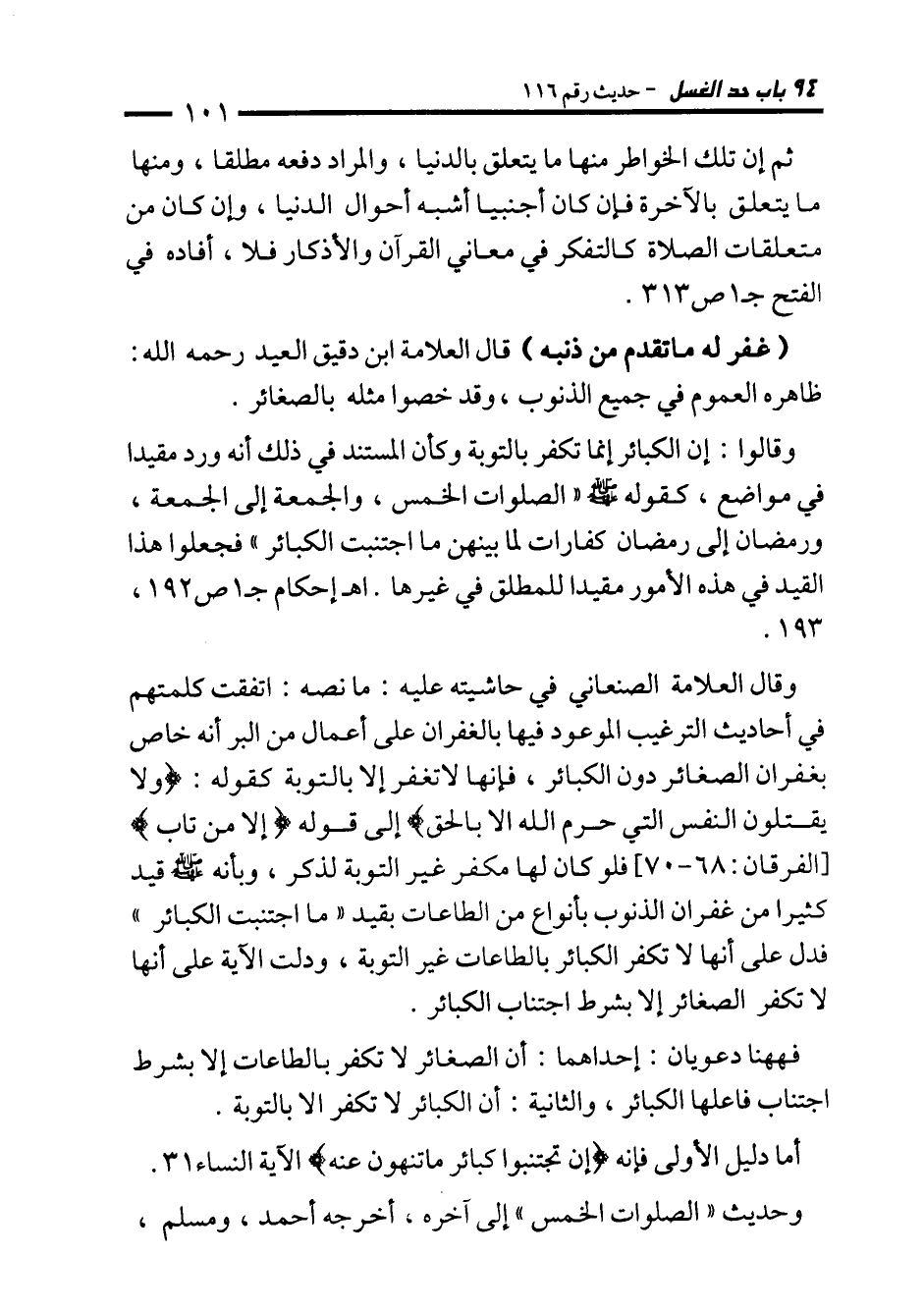 وقال العلامة الصنعاني في حاشيته عليه: ما نصه: اتفقت كلمتهم في أحاديث الترغيب الموعود فيها بالغفران على أعمال من البر أنه خاص بغفران الصغائر دون الكبائر، فإنها لا تغفر إلا بالتوبة كقوله: {وَلَا يَقْتُلُونَ النَّفْسَ الَّتِي حَرَّمَ اللَّهُ إِلَّا بِالْحَقِّ} إلى قوله {إِلَّا مَنْ تَابَ} [الفرقان: 68 - 70}، فلو كان لها مكفر غير التوبة لذكر، وبأنه - صلى الله عليه وسلم - قيد كثيرا من غفران الذنوب بأنواع من الطاعات بقيد "ما اجتنبت الكبائر" فدل على أنها لا تكفر الكبائر بالطاعات غير التوبة، ودلت الآية على أنها لا تكفر الصغائر إلا بشرط اجتناب الكبائر.
