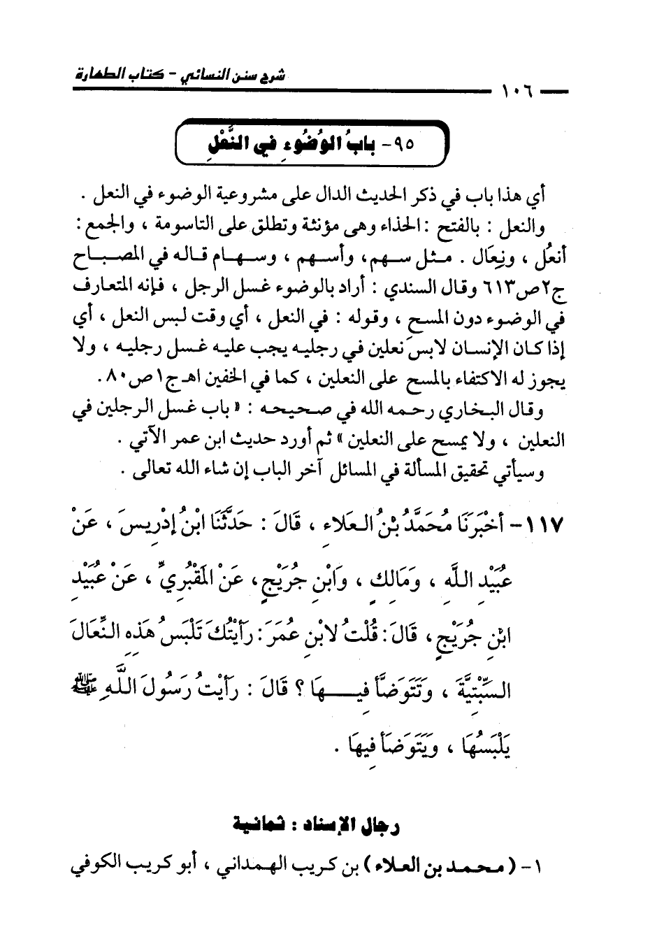 117 - أَخْبَرَنَا مُحَمَّدُ بْنُ الْعَلاَءِ، قَالَ: حَدَّثَنَا ابْنُ إِدْرِيسَ، عَنْ عُبَيْدِ اللهِ، وَمَالِكٍ، وَابْنِ جُرَيْجٍ، عَنِ الْمَقْبُرِيِّ، عَنْ عُبَيْدِ بْنِ جُرَيْجٍ، قَالَ: قُلْتُ لاِبْنِ عُمَرَ: رَأَيْتُكَ تَلْبَسُ هَذِهِ النِّعَالَ السِّبْتِيَّةَ، وَتَتَوَضَّأُ فِيهَا؟ قَالَ: رَأَيْتُ رَسُولَ اللهِ - صلى الله عليه وسلم - يَلْبَسُهَا وَيَتَوَضَّأُ فِيهَا.