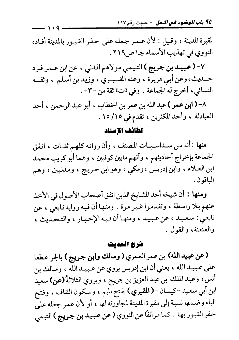 ومنها: أن شيخه أحد المشايخ الذين اتفق أصحاب الأصول في الأخذ عنهم بلا واسطة، وتقدموا غير مرة. ومنها أن فيه رواية تابعي، عن تابعي: سعيد، عن عبيد، ومنها أن فيه الإخبار، والتحديث،
