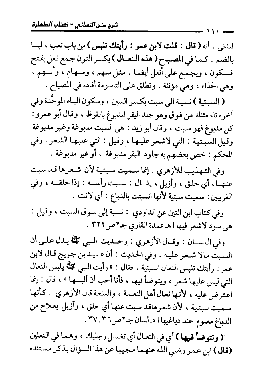 وفي اللسان: وقال الأزهري: وحديث النبي - صلى الله عليه وسلم - يدل على أن السبت ما لا شعر عليه. وفي الحديث: أن عبيد بن جريج قال لابن عمر: رأيتك تلبس النعال السبتية، فقال: "رأيت النبي - صلى الله عليه وسلم - يلبس النعال التي ليس عليها شعر، ويتوضأ فيها، فأنا أحب أن ألبسها "، قال: إنما اعترض عليه؛ لأنها نعال أهل النعمة، والسعة قال الأزهري: كأنها سميت سبتية؛ لأن شعرها قد سبت عنها أي حلق، وأزيل بعلاج من الدباغ معلوم عند دباغيها اهـ لسان جـ 2 ص 36، 37.