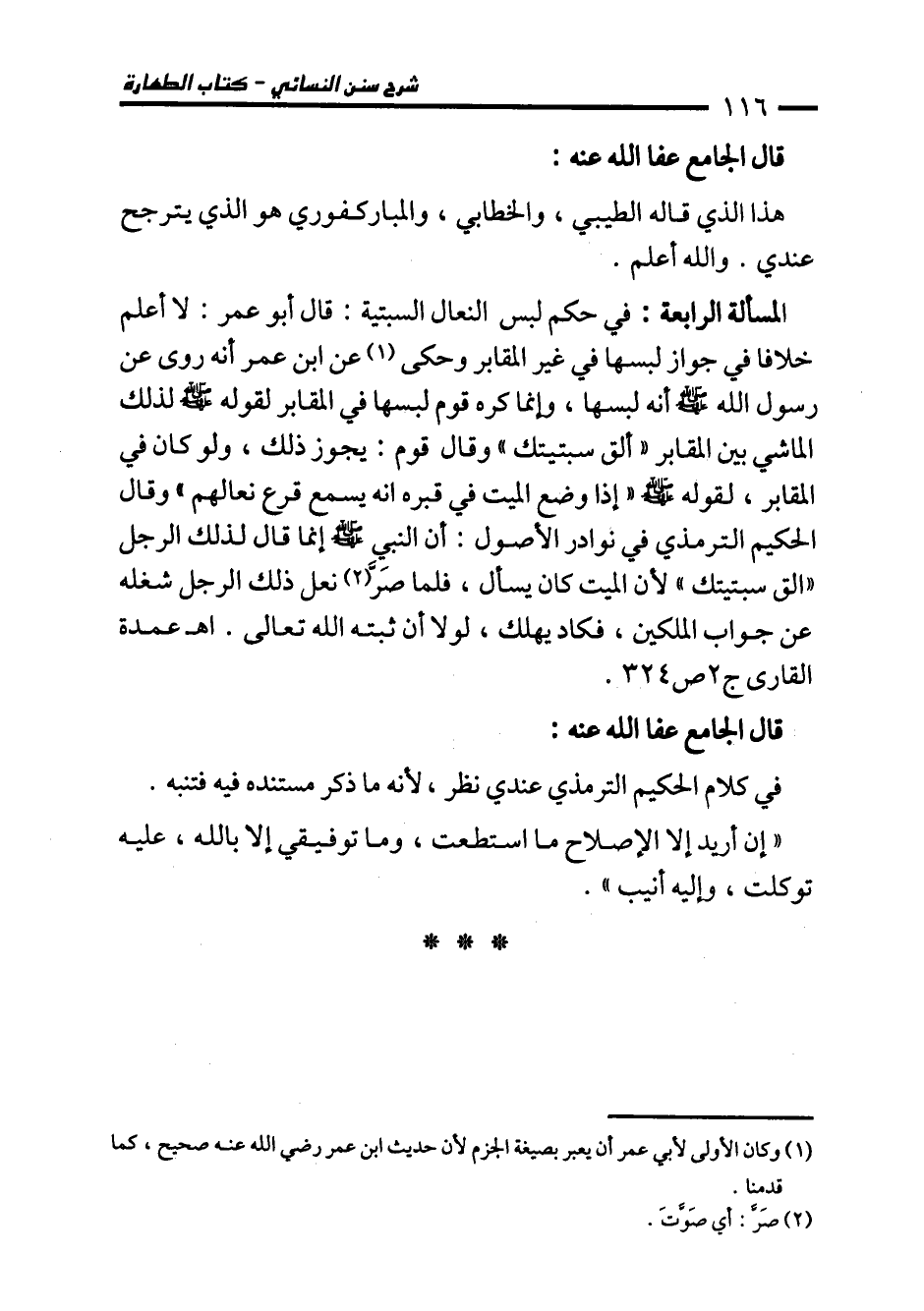 المسألة الرابعة: في حكم لبس النعال السبتية: قال أبو عمر: لا أعلم خلافا في جواز لبسها في غير المقابر وحكى (¬1) عن ابن عمر أنه روى عن رسول الله - صلى الله عليه وسلم - أنه لبسها، وإنما كره قوم لبسها في المقابر لقوله - صلى الله عليه وسلم - لذلك الماشي بين المقابر "ألق سبتيتك" وقال قوم: يجوز ذلك، ولو كان في المقابر، لقوله - صلى الله عليه وسلم - "إذا وضع الميت في قبره انه يسمع قرع نعالهم" وقال الحكيم الترمذي في نوادر الأصول: أن النبي - صلى الله عليه وسلم - إنما قال لذلك الرجل "الق سبتيتك" لأن الميت كان يسأل، فلما صَرَّ (¬2) نعل ذلك الرجل شغله عن جواب الملكين، فكاد يهلك، لولا أن ثبته الله تعالى. اهـ عمدة القارى ج 2 ص 324.