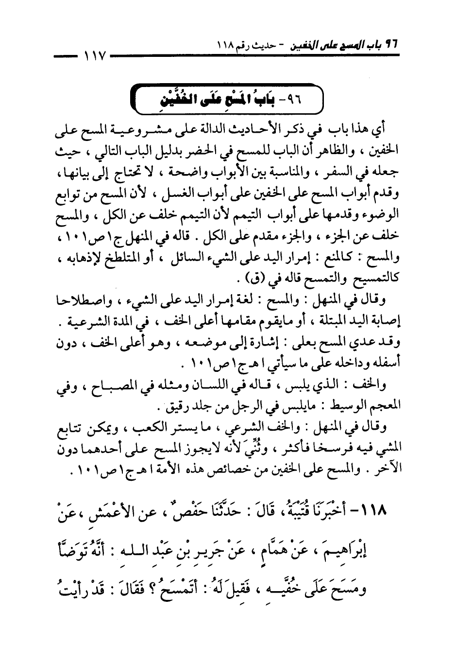 118 - أَخْبَرَنَا قُتَيْبَةُ، قَالَ: حَدَّثَنَا حَفْصٌ، عَنِ الأَعْمَشِ، عَنْ إِبْرَاهِيمَ، عَنْ هَمَّامٍ، عَنْ جَرِيرِ بْنِ عَبْدِ اللهِ: أَنَّهُ تَوَضَّأَ وَمَسَحَ عَلَى خُفَّيْهِ، فَقِيلَ لَهُ: أَتَمْسَحُ؟ فَقَالَ: قَدْ رَأَيْتُ