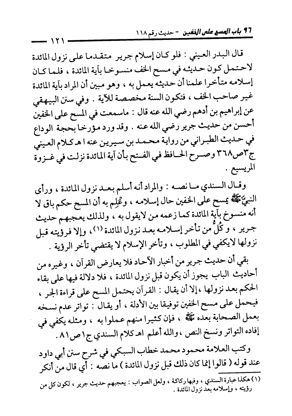 بقي أن حديث جرير من أخبار الآحاد فلا يعارض القرآن، وغيره من أحاديث الباب يجوز أن يكون قبل نزول المائدة، فلا دلالة فيها على بقاء الحكم بعد نزولها، إلا أن يقال: القرآن يحتمل المسح على قراءة الجر، فيحمل على مسح الخفين توفيقا بين الأدلة، أو يقال: تواتر عدم نسخه بعمل الصحابة بعده - صلى الله عليه وسلم -، فإن كثيرا منهم عملوا به، ومثله يكفي في إفاده التواتر ونسخ افص، والله أعلم اهـ كلام السندي ج 1 ص 81.