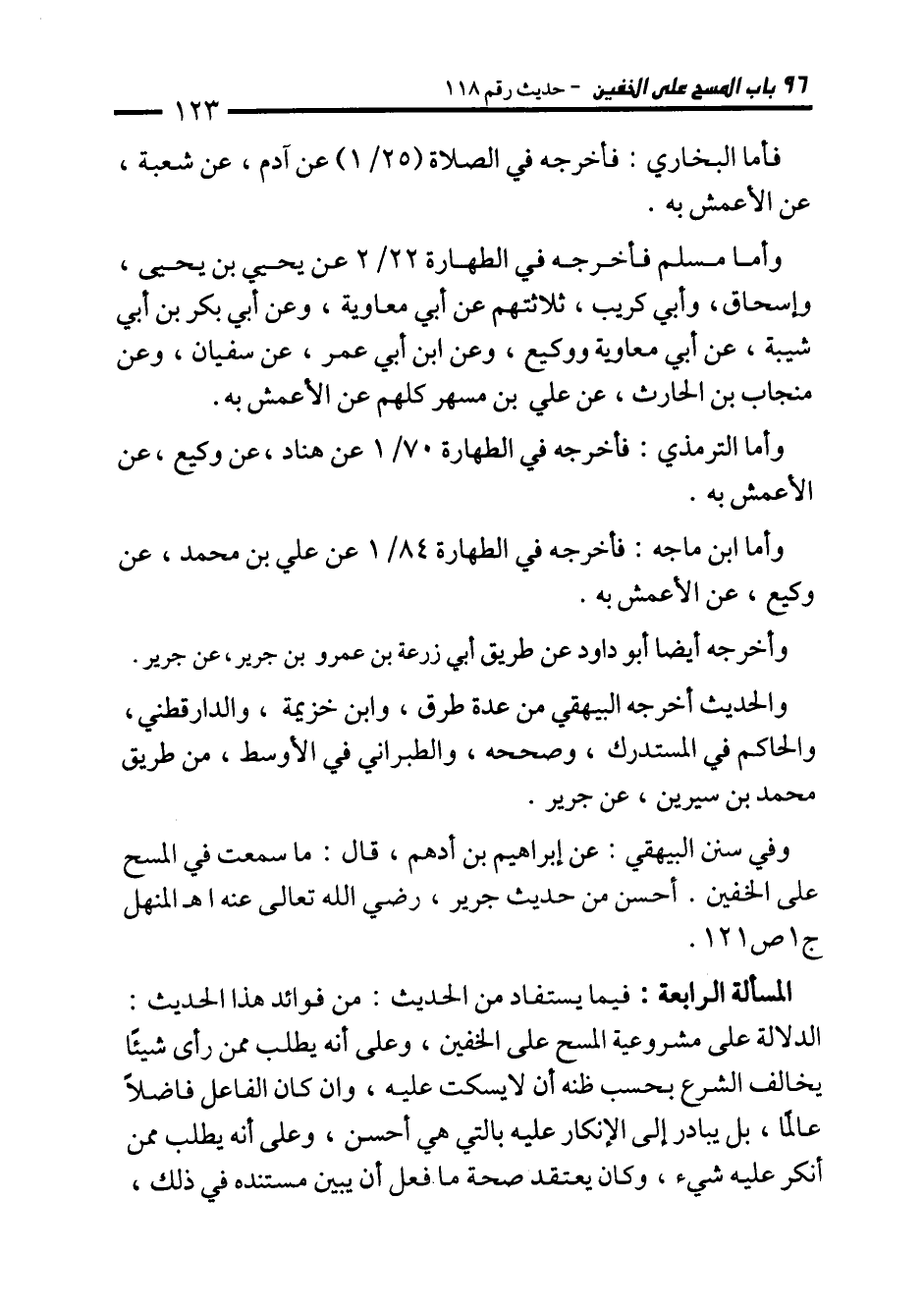 وفي سنن البيهقي: عن إبراهيم بن أدهم، قال: ما سمعت في المسح على الخفين. أحسن من حديث جرير، رضي الله تعالى عنه اهـ المنهل ج 1 ص 121.