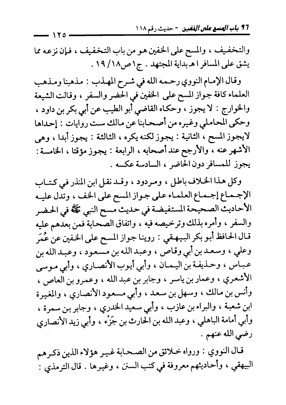 وكل هذا الخلاف باطل، ومردود، وقد نقل ابن المنذر في كتاب الإجماع إجماع العلماء على جواز المسح على الخف، وتدل عليه الأحاديث الصحيحة المستفيضة في حديث مسح النبي - صلى الله عليه وسلم - في الحضر والسفر، وأمره بذلك وترخيصه فيه، واتفاق الصحابة فمن بعدهم عليه قال الحافظ أبو بكر البيهقي: روينا جواز المسح على الخفين عن عُمَر وعلي، وسعد بن أبي وقاص، وعبد الله بن مسعود، وعبد الله بن عباس، وحذيفة بن اليمان، وأبي أيوب الأنصاري، وأبي موسى الأشعري، وعمار بن ياسر، وجابر بن عبد الله، وعمرو بن العاص، وأنس بن مالك، وسهل بن سعد، وأبي مسعود الأنصاري، والمغيرة ابن شعبة، والبراء بن عازب، وأبي سعيد الخدري، وجابر بن سمرة، وأبي أمامة الباهلي، وعبد الله بن الحارث بن جَزْء، وأبي زيد الأنصاري رضي الله عنهم.