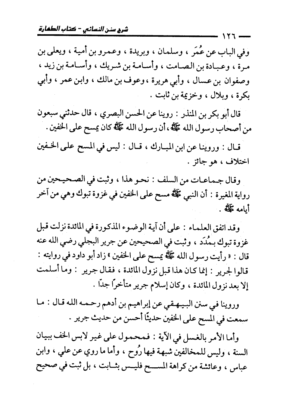 قال أبو بكر بن المنذر: روينا عن الحسن البصري، قال حدثني سبعون من أصحاب رسول الله - صلى الله عليه وسلم -، أن رسول الله - صلى الله عليه وسلم - كان يمسح على الخفين.