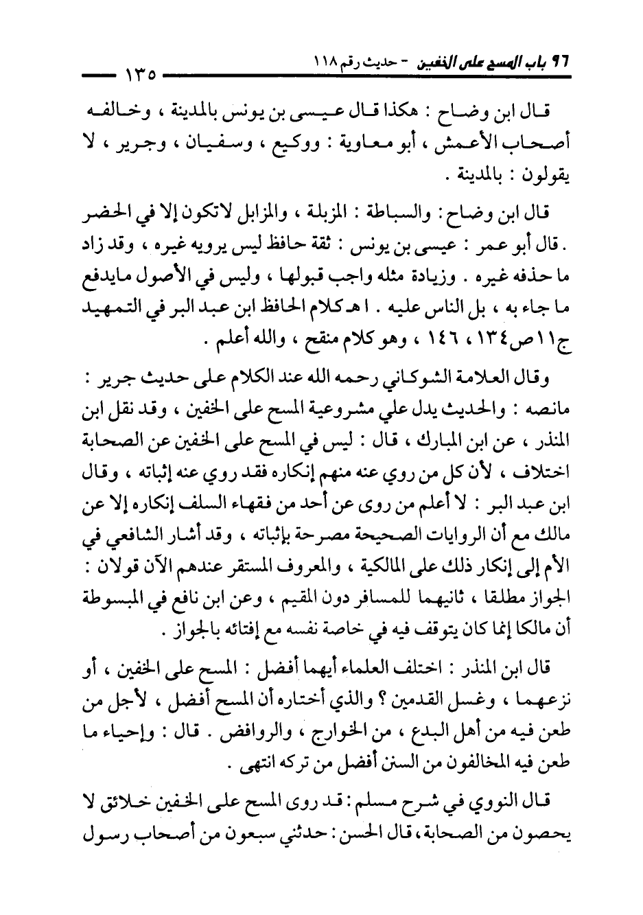 وقال العلامة الشوكاني رحمه الله عند الكلام على حديث جرير: ما نصه: والحديث يدل علي مشروعية المسح على الخفين، وقد نقل ابن المنذر، عن ابن المبارك، قال: ليس في المسح على الخفين عن الصحابة اختلاف؛ لأن كل من روي عنه منهم إنكاره فقد روي عنه إثباته، وقال ابن عبد البر: لا أعلم من روى عن أحد من فقهاء السلف إنكاره إلا عن مالك مع أن الروايات الصحيحة مصرحة بإثباته، وقد أشار الشافعي في الأم إلى إنكار ذلك على المالكية، والمعروف المستقر عندهم الآن قولان: