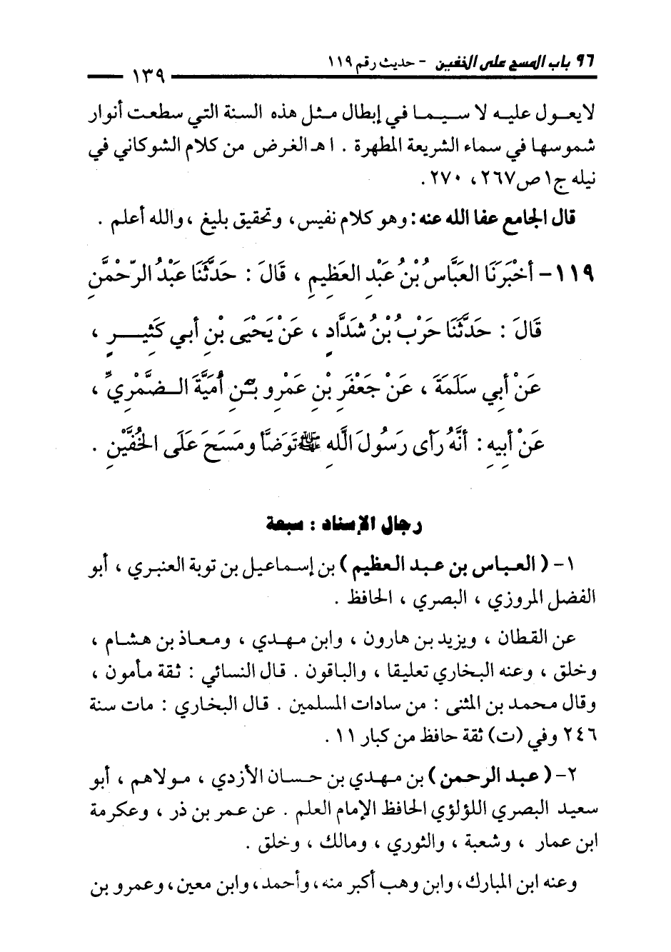 119 - أَخْبَرَنَا الْعَبَّاسُ بْنُ عَبْدِ الْعَظِيمِ، قَالَ: حَدَّثَنَا عَبْدُ الرَّحْمَنِ، قَالَ: حَدَّثَنَا حَرْبُ بْنُ شَدَّادٍ، عَنْ يَحْيَى بْنِ أَبِي كَثِيرٍ، عَنْ أَبِي سَلَمَةَ، عَنْ جَعْفَرِ بْنِ عَمْرِو بْنِ أُمَيَّةَ الضَّمْرِيِّ، عَنْ أَبِيهِ أَنَّهُ رَأَى رَسُولَ اللهِ - صلى الله عليه وسلم - تَوَضَّأَ وَمَسَحَ عَلَى الْخُفَّيْنِ.