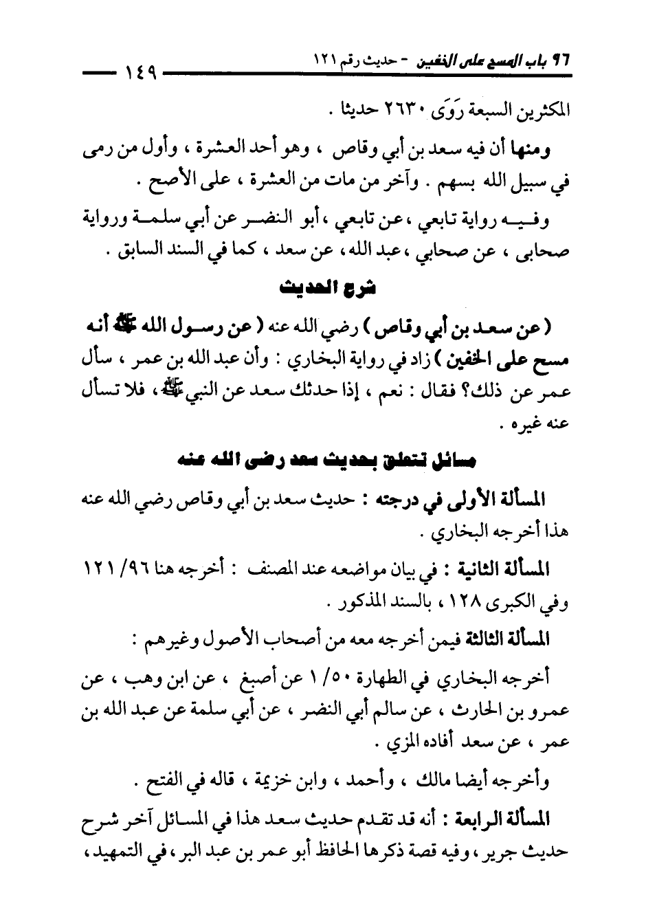 (عن سعد بن أبي وقاص) رضي الله عنه (عن رسول الله - صلى الله عليه وسلم - أنه مسح على الخفين) زاد في رواية البخاري: وأن عبد الله بن عمر، سأل عمر عن ذلك؟ فقال: نعم، إذا حدثك سعد عن النبي - صلى الله عليه وسلم -، فلا تسأل عنه غيره.