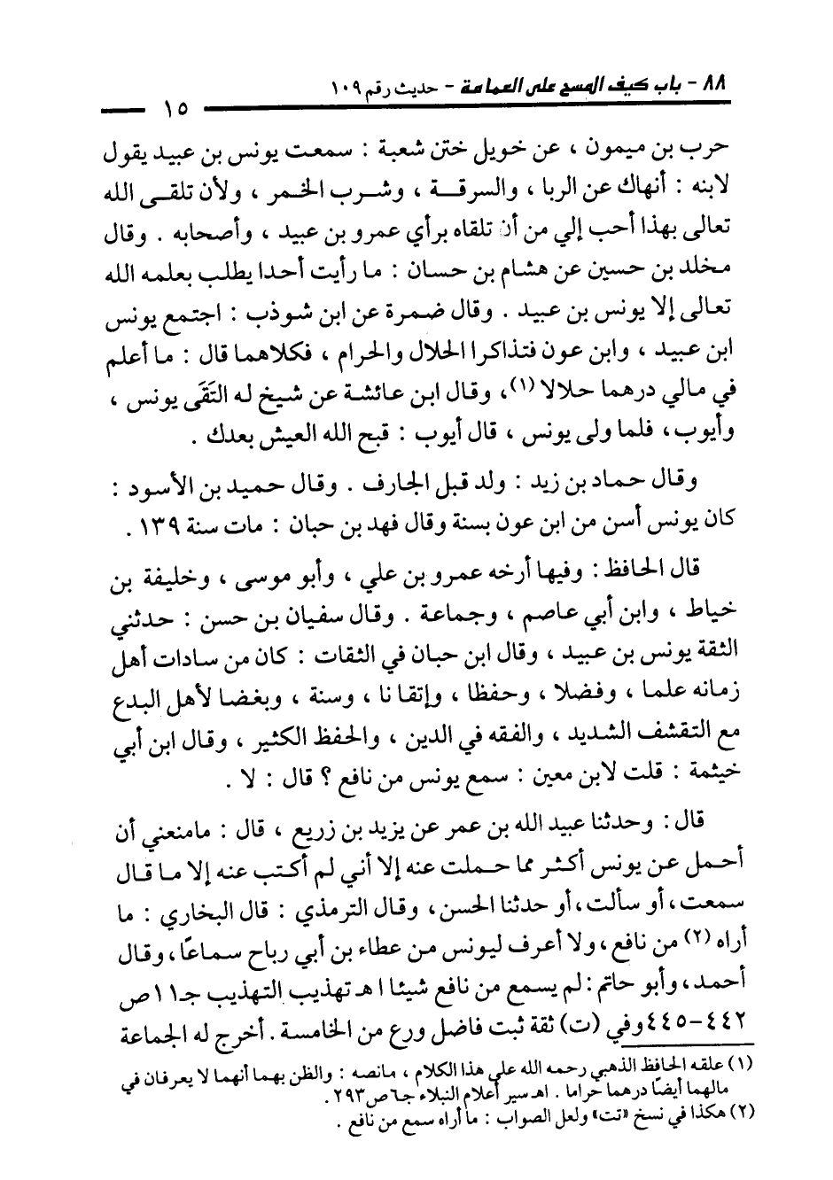 قال: وحدثنا عبيد الله بن عمر عن يزيد بن زريع، قال: ما منعني أن أحمل عن يونس أكثر مما حملت عنه إلا أني لم أكتب عنه إلا ما قال سمعت، أو سألت، أو حدثنا الحسن، وقال الترمذي: قال البخاري: ما أراه (¬2) من نافع، ولا أعرف ليونس من عطاء بن أبي رباح سماعًا، وقال أحمد، وأبو حاتم: لم يسمع من نافع شيئا اهـ تهذيب التهذيب جـ 11 ص 442 - 445 وفي (ت) ثقة ثبت فاضل ورع من الخامسة. أخرج له الجماعة