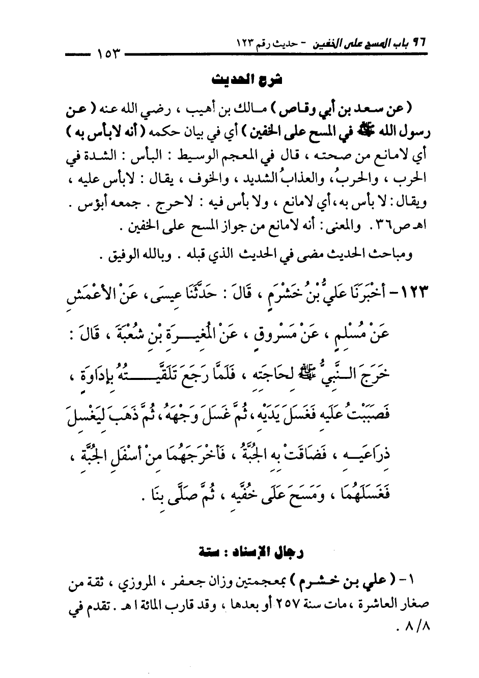 123 - أَخْبَرَنَا عَلِىُّ بْنُ خَشْرَمٍ، قَالَ: حَدَّثَنَا عِيسَى، عَنِ الأَعْمَشِ، عَنْ مُسْلِمٍ، عَنْ مَسْرُوقٍ، عَنِ الْمُغِيرَةِ بْنِ شُعْبَةَ، قَالَ: خَرَجَ النَّبِيُّ - صلى الله عليه وسلم - لِحَاجَتِهِ، فَلَمَّا رَجَعَ تَلَقَّيْتُهُ بِإِدَاوَةٍ، فَصَبَبْتُ عَلَيْهِ فَغَسَلَ يَدَيْهِ، ثُمَّ غَسَلَ وَجْهَهُ، ثُمَّ ذَهَبَ لِيَغْسِلَ ذِرَاعَيْهِ، فَضَاقَتْ بِهِ الْجُبَّةُ، فَأَخْرَجَهُمَا مِنْ أَسْفَلِ الْجُبَّةِ، فَغَسَلَهُمَا، وَمَسَحَ عَلَى خُفَّيْهِ، ثُمَّ صَلَّى بِنَا.