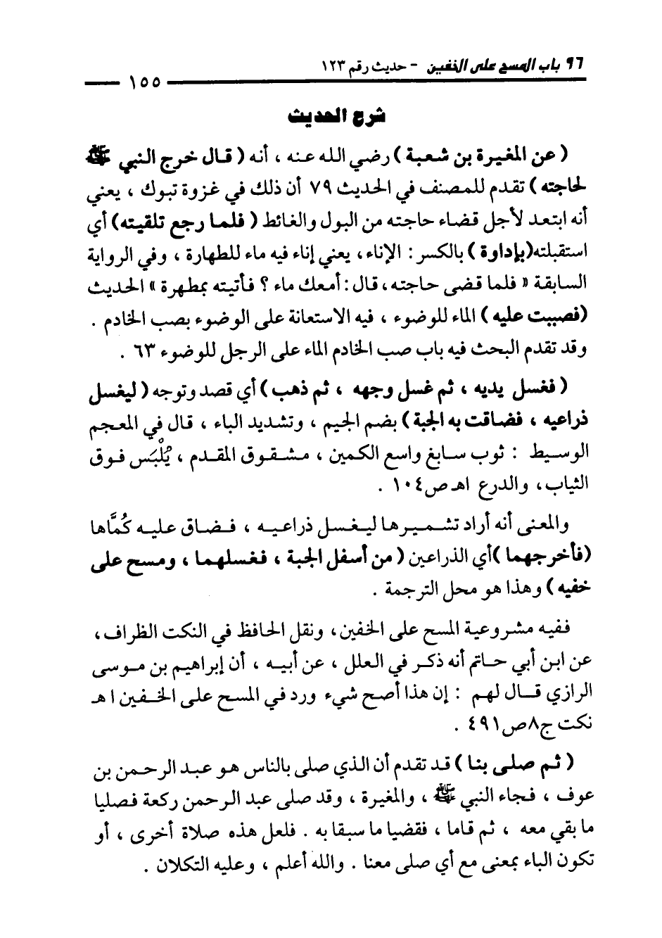 (عن المغيرة بن شعبة) رضي الله عنه، أنه (قال خرج النبي - صلى الله عليه وسلم - لحاجته) تقدم للمصنف في الحديث 79 أن ذلك في غزوة تبوك، يعني أنه ابتعد لأجل قضاء حاجته من البول والغائط (فلما رجع تلقيته) أي استقبلته (بإداوة) بالكسر: الإناء، يعني إناء فيه ماء للطهارة، وفي الرواية السابقة "فلما قضى حاجته، قال: أمعك ماء؟ فأتيته بمطهرة" الحديث (فصببت عليه) الماء للوضوء، فيه الاستعانة على الوضوء بصب الخادم. وقد تقدم البحث فيه باب صب الخادم الماء على الرجل للوضوء 63.