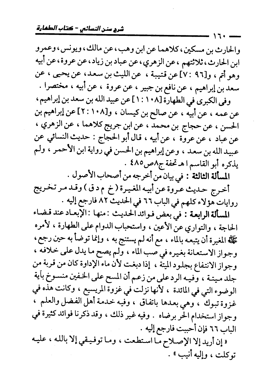 وفي الكبرى في الطهارة [108: 1]، عن عبيد الله بن سعد بن إبراهيم، عن عمه، عن أبيه، عن صالح بن كيسان، و [108: 2] عن إبراهيم بن الحسن، عن حجاج بن محمَّد، عن ابن جريج كلاهما، عن الزهري، عن عباد، عن عروة، عن أبيه، قال أبو الحجاج: حديث النسائي عن عبيد الله بن سعد، وعن إبراهيم بن الحسن في رواية ابن الأحمر، ولم يذكره أبو القاسم اهـ تحفة ج 8 ص 485.