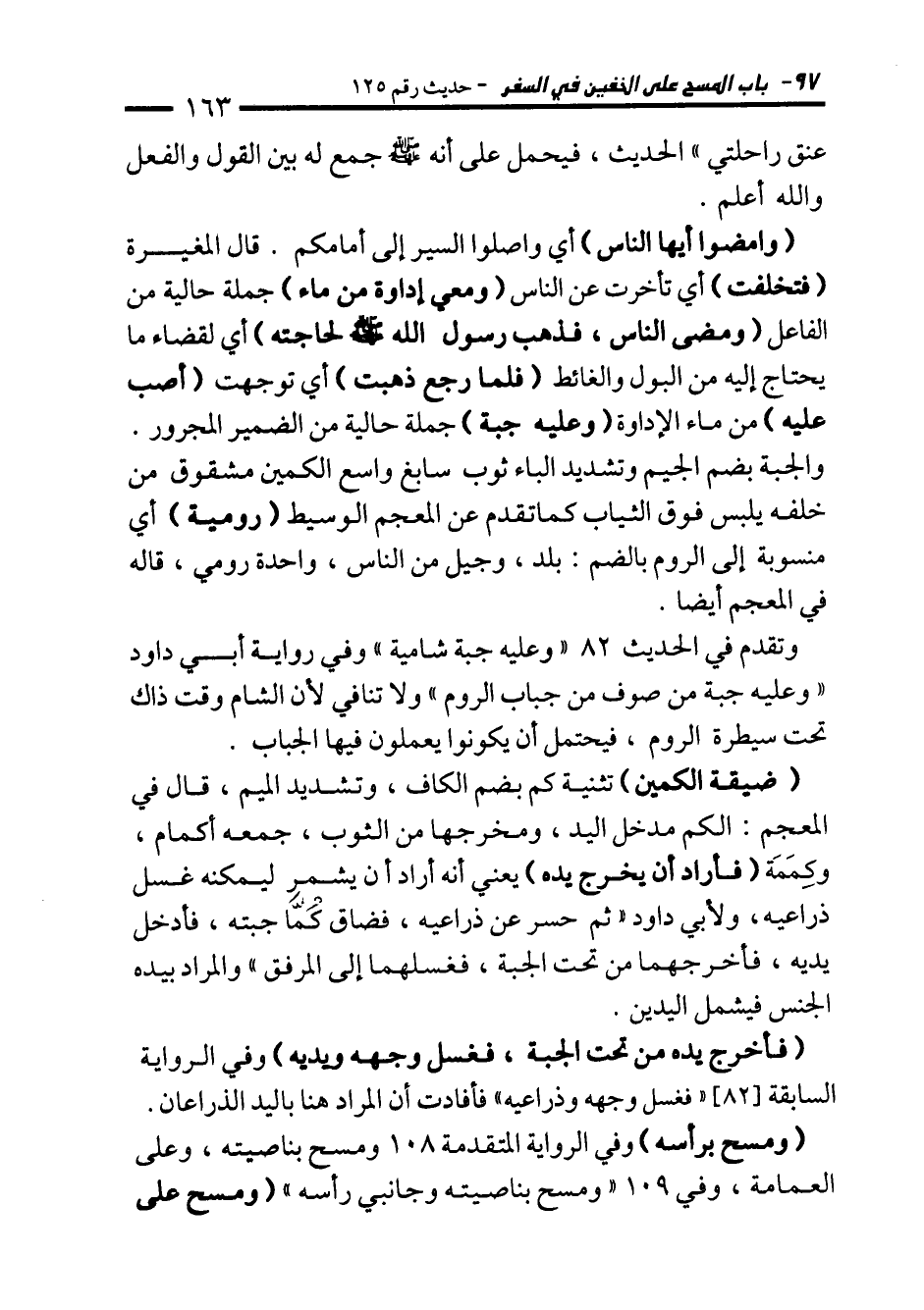 (وامضوا أيها الناس) أي واصلوا السير إلى أمامكم. قال المغيرة (فتخلفت) أي تأخرت عن الناس (ومعي إداوة من ماء) جملة حالية من الفاعل (ومضى الناس، فذهب رسول الله - صلى الله عليه وسلم - لحاجته) أي لقضاء ما يحتاج إليه من البول والغائط (فلما رجع ذهبت) أي توجهت (أصب عليه) من ماء الإداوة (وعليه جبة) جملة حالية من الضمير المجرور. والجبة بضم الجيم وتشديد الباء ثوب سابغ واسع الكمين مشقوق من خلفه يلبس فوق الثياب كما تقدم عن المعجم الوسيط (رومية) أي منسوبة إلى الروم بالضم: بلد، وجيل من الناس، واحدة رومي، قاله في المعجم أيضا.