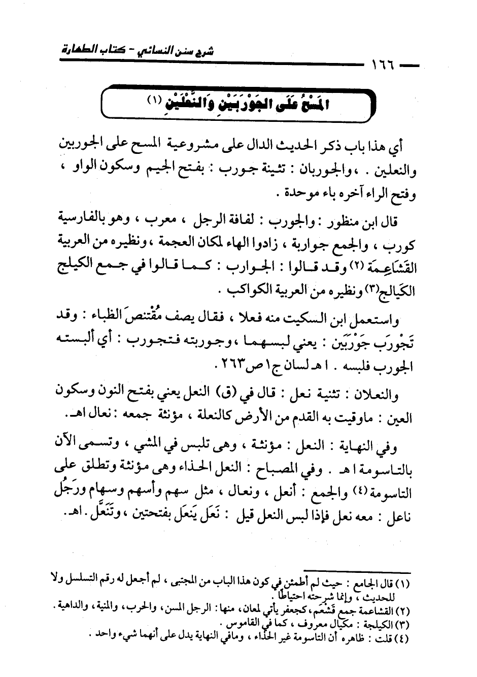 قال ابن منظور: والجورب: لفافة الرجل، معرب، وهو بالفارسية كورب، والجمع جواربة، زادوا الهاء لمكان المعجمة، ونظيره من العربية القَشَاعِمَة (¬2) وقد قالوا: الجوارب: كما قالوا في جمع الكيلج الكَيالج (¬3) ونظيره من العربية الكواكب.