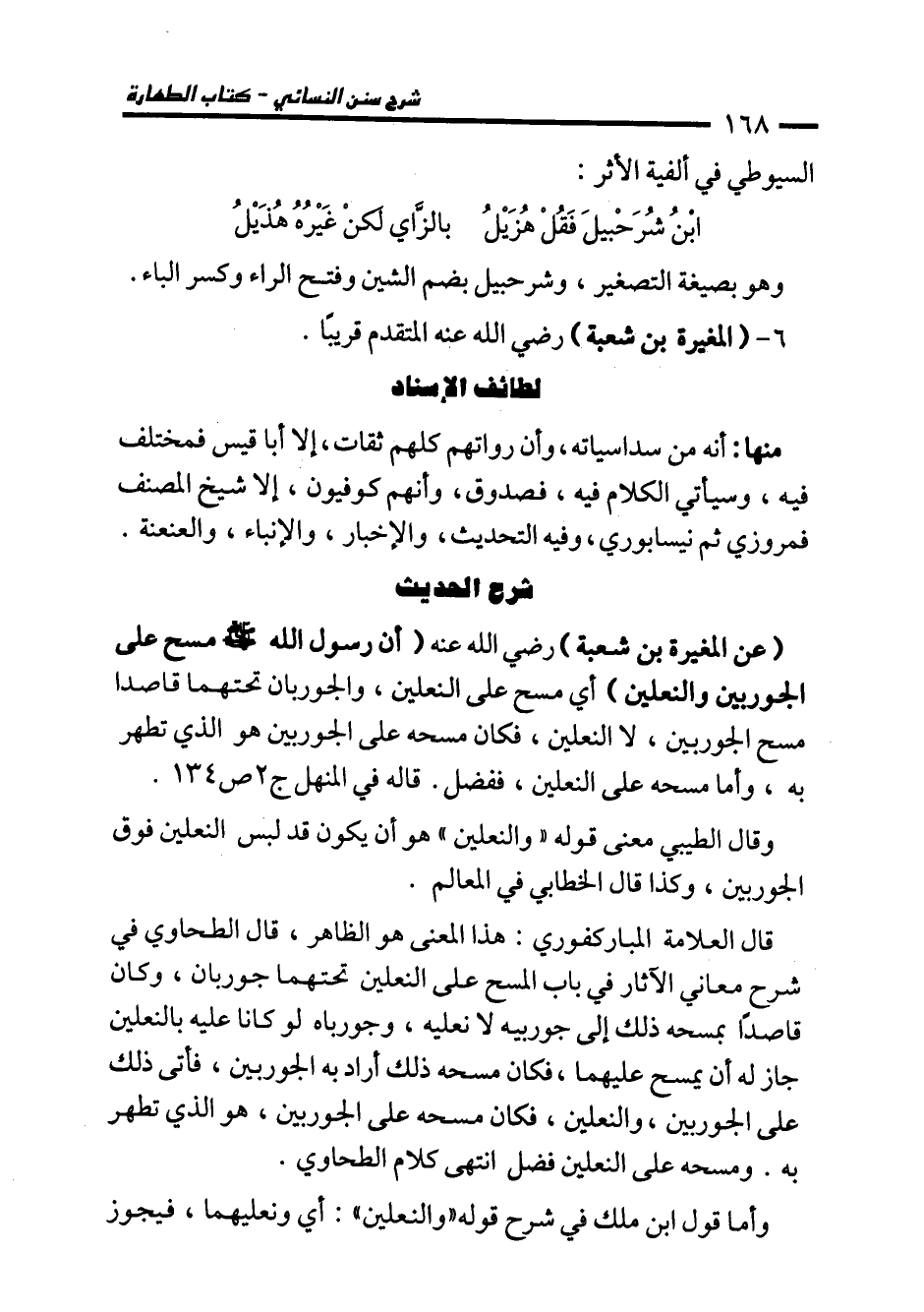 قال العلامة المباركفوري: هذا المعنى هو الظاهر، قال الطحاوي في شرح معاني الآثار في باب المسح على النعلين تحتهما جوربان، وكان قاصدًا بمسحه ذلك إلى جوربيه لا نعليه، وجورباه لو كانا عليه بالنعلين جاز له أن يمسح عليهما، فكان مسحه ذلك أراد به الجوربين، فأتى ذلك على الجوربين، والنعلين، فكان مسحه على الجوربين، هو الذي تطهير به. ومسحه على النعلين فضل انتهى كلام الطحاوي.