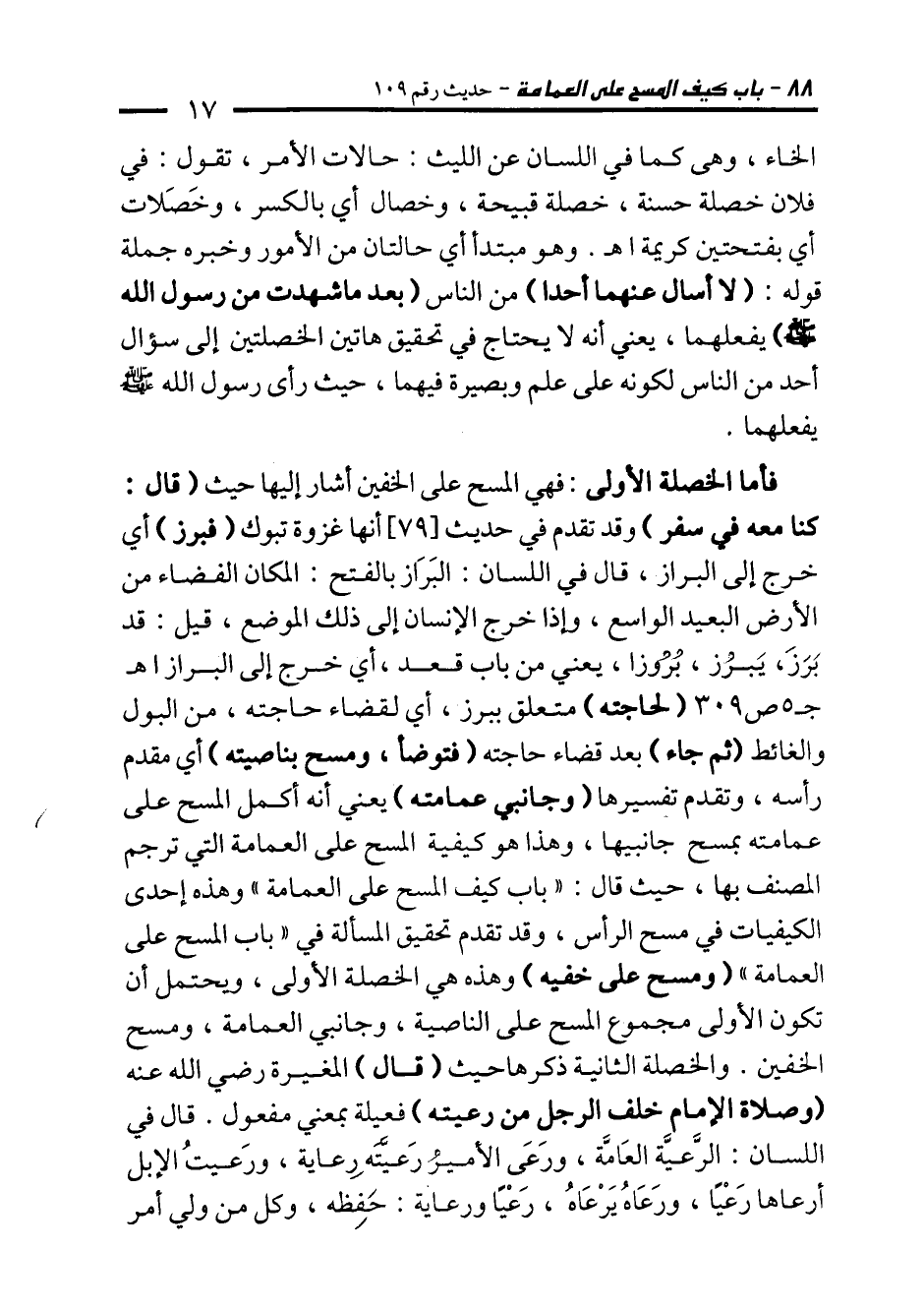 فأما الخصلة الأولى: فهي المسح على الخفين أشار إليها حيث (قال: كنا معه في سفر) وقد تقدم في حديث [79] أنها غزوة تبوك (فبرز) أي خرج إلى البراز، قال في اللسان: البَرَاز بالفتح: المكان الفضاء من الأرض البعيد الواسع، وإذا خرج الإنسان إلى ذلك الموضع، قيل: قد بَرَزَ، يَبرُز، بُرُوزا، يعني من باب قعد، أي خرج إلى البراز اهـ جـ 5 ص 309 (لحاجته) متعلق ببرز، أي لقضاء حاجته، من البول والغائط (ثم جاء) بعد قضاء حاجته (فتوضأ، ومسح بناصيته) أي مقدم رأسه، وتقدم تفسيرها (وجانبي عمامته) يعني أنه أكمل المسح على عمامته بمسح جانبيها، وهذا هو كيفية المسح على العمامة التي ترجم الصنف بها، حيث قال: "باب كيف المسح على العمامة" وهذه إحدى الكيفيات في مسح الرأس، وقد تقدم تحقيق المسألة في "باب المسح على العمامة" (ومسح على خفيه) وهذه هي الخصلة الأولى، ويحتمل أن تكون الأولى مجموع المسح على الناصية، وجانبي العمامة، ومسح الخفين. والخصلة الثانية ذكرها حيث (قال) المغيرة رضي الله عنه (وصلاة الإمام خلف الرجل من رعيته) فعيلة بمعني مفعول. قال في اللسان: الرَّعيَّة العَامَّة، ورَعَى الأميرُ رَعيَّتَه رِعاية، ورَعيتُ الإبل أرعاها رَعْيًا، ورَعَاهُ يَرْعَاهُ، رَعْيًا ورعاية: حَفِظه، وكل من ولي أمر