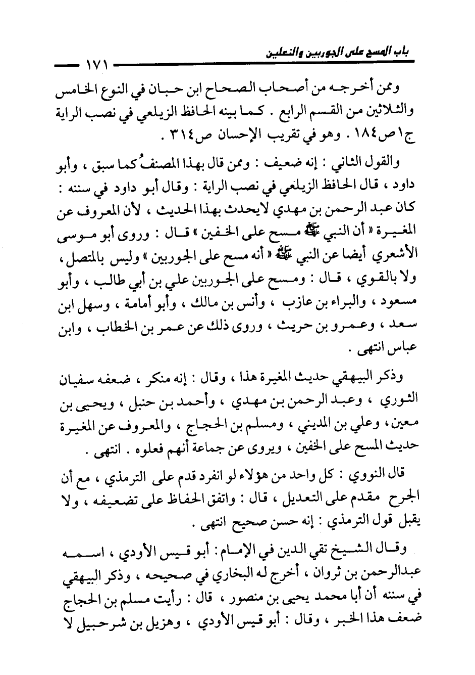 داود، قال الحافظ الزيلعي في نصب الراية: وقال أبو داود في سننه: كان عبد الرحمن بن مهدي لا يحدث بهذا الحديث؛ لأن المعروف عن المغيرة "أن النبي - صلى الله عليه وسلم - مسح على الخفين" قال: وروى أبو موسى الأشعري أيضا عن النبي - صلى الله عليه وسلم - "أنه مسح على الجوربين" وليس بالمتصل، ولا بالقوي، قال: ومسح على الجوربين علي بن أبي طالب، وأبو مسعود، والبراء بن عازب، وأنس بن مالك، وأبو أمامة، وسهل ابن سعد، وعمرو بن حريث، وروى ذلك عن عمر بن الخطاب، وابن عباس انتهى.