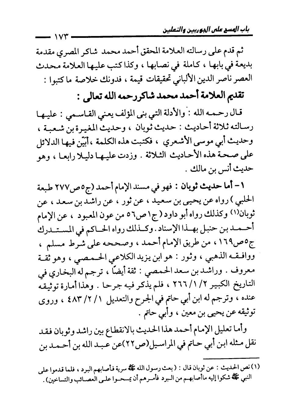 وأما تعليل الإمام أحمد هذا الحديث بالانقطاع بين راشد وثوبان فقد نقل مثله ابن أبي حاتم في المراسيل (ص 22) عن عبد الله بن أحمد بن